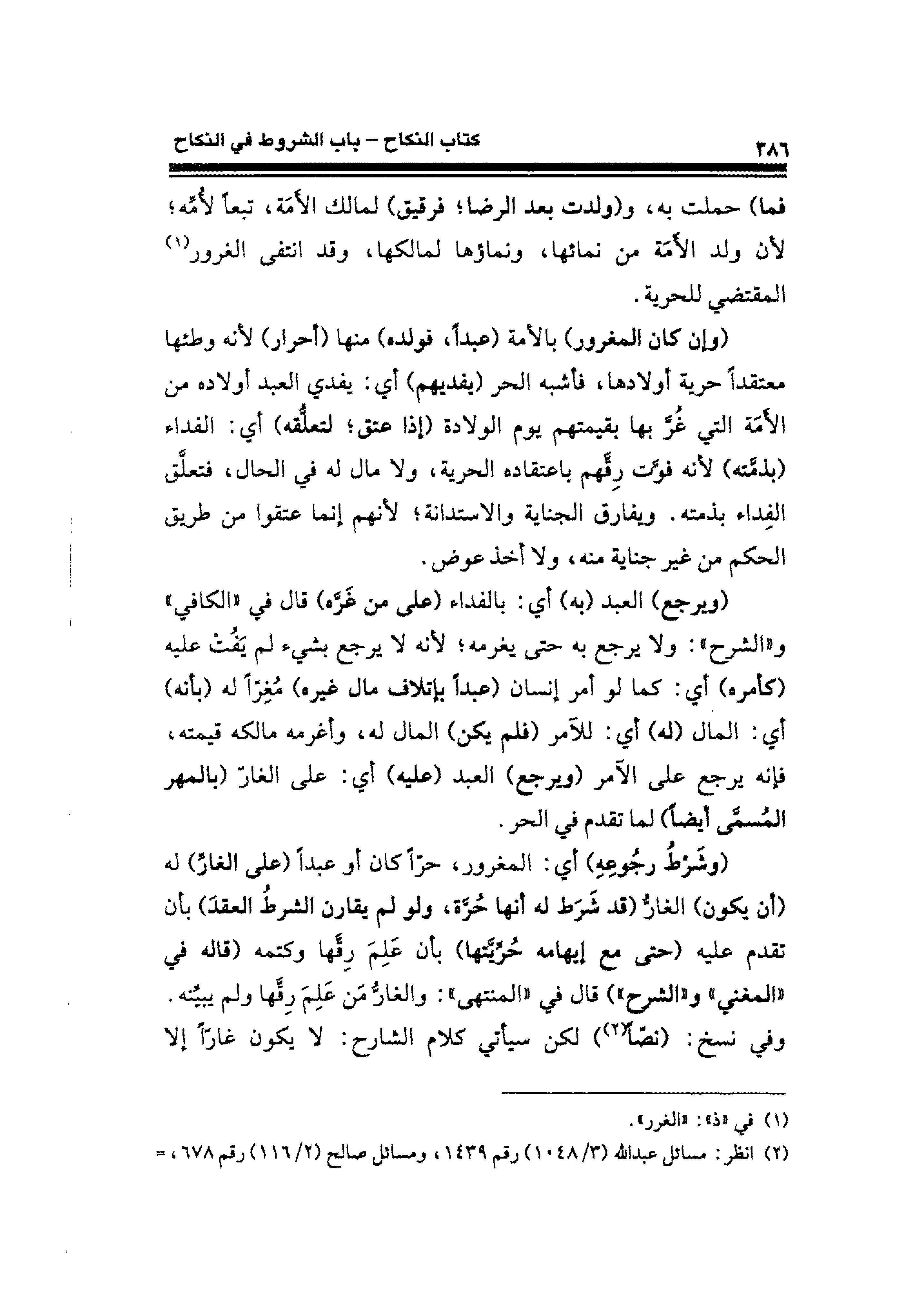 (وشَرْطُ رجُوعِهِ) أي: المغرور، حرًّا كان أو عبدًا (على الغارِّ) له (أن يكون) الغارُّ (قد شَرَط له أنها حُرَّة، ولو لم يقارن الشرطُ العقدَ) بأن تقدم عليه (حتى مع إيهامه حُرِّيَّتها) بأن عَلِمَ رِقَّها وكتمه (قاله في "المغني" و "الشرح") قال في "المنتهى": والغارُّ مَن عَلِمَ رِقَّها ولم يبيِّنه. وفي نسخ: (نصًّا (¬٢)) لكن سيأتي كلام الشارح: لا يكون غارًّا إلا