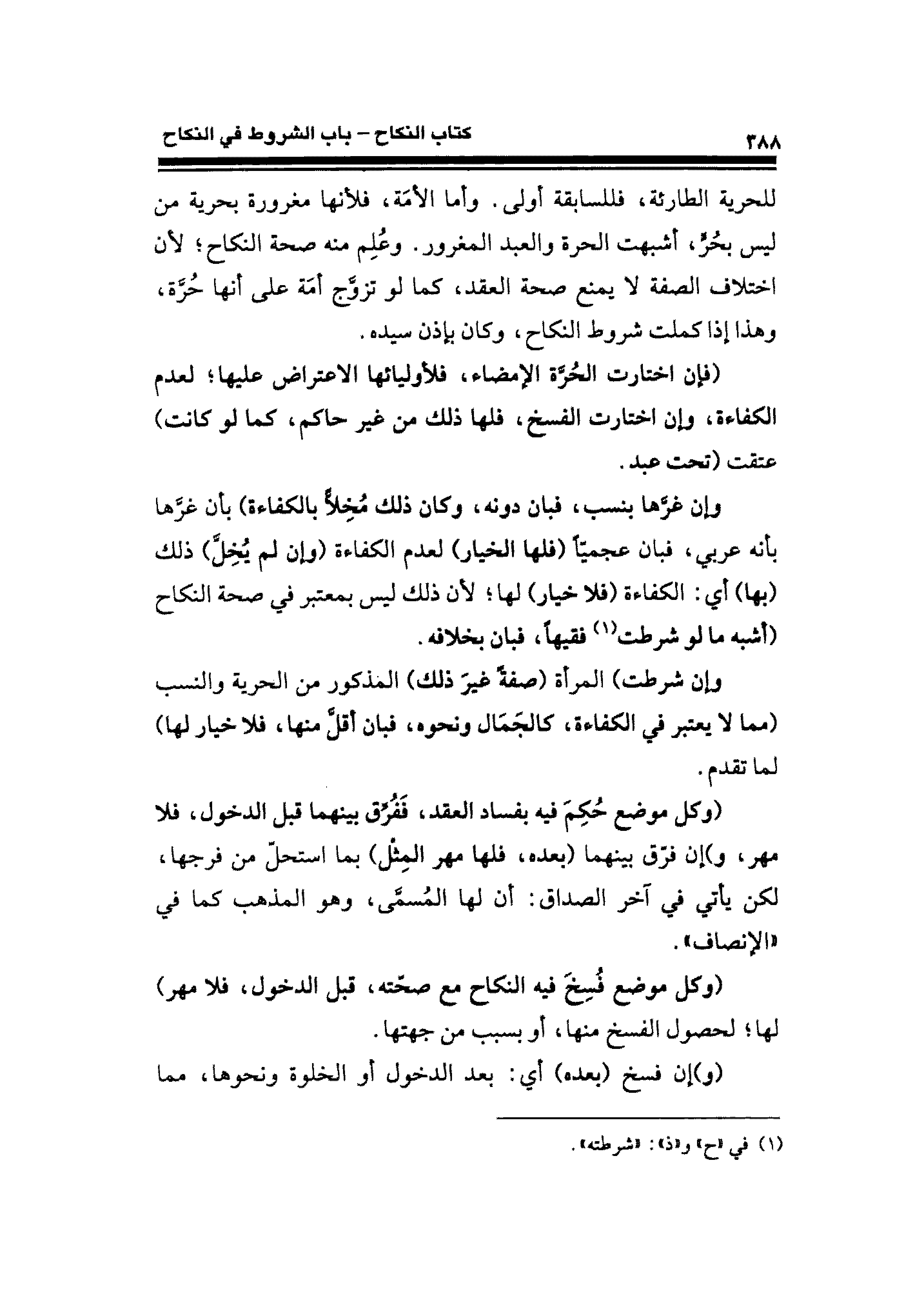 للحرية الطارئة، فللسابقة أولى. وأما الأمَة، فلأنها مغرورة بحرية من ليس بحُرٍّ، أشبهت الحرة والعبد المغرور. وعُلِم منه صحة النكاح؛ لأن اختلاف الصفة لا يمنع صحة العقد، كما لو تزوَّج أمَة على أنها حُرَّة، وهذا إذا كملت شروط النكاح، وكان بإذن سيده.