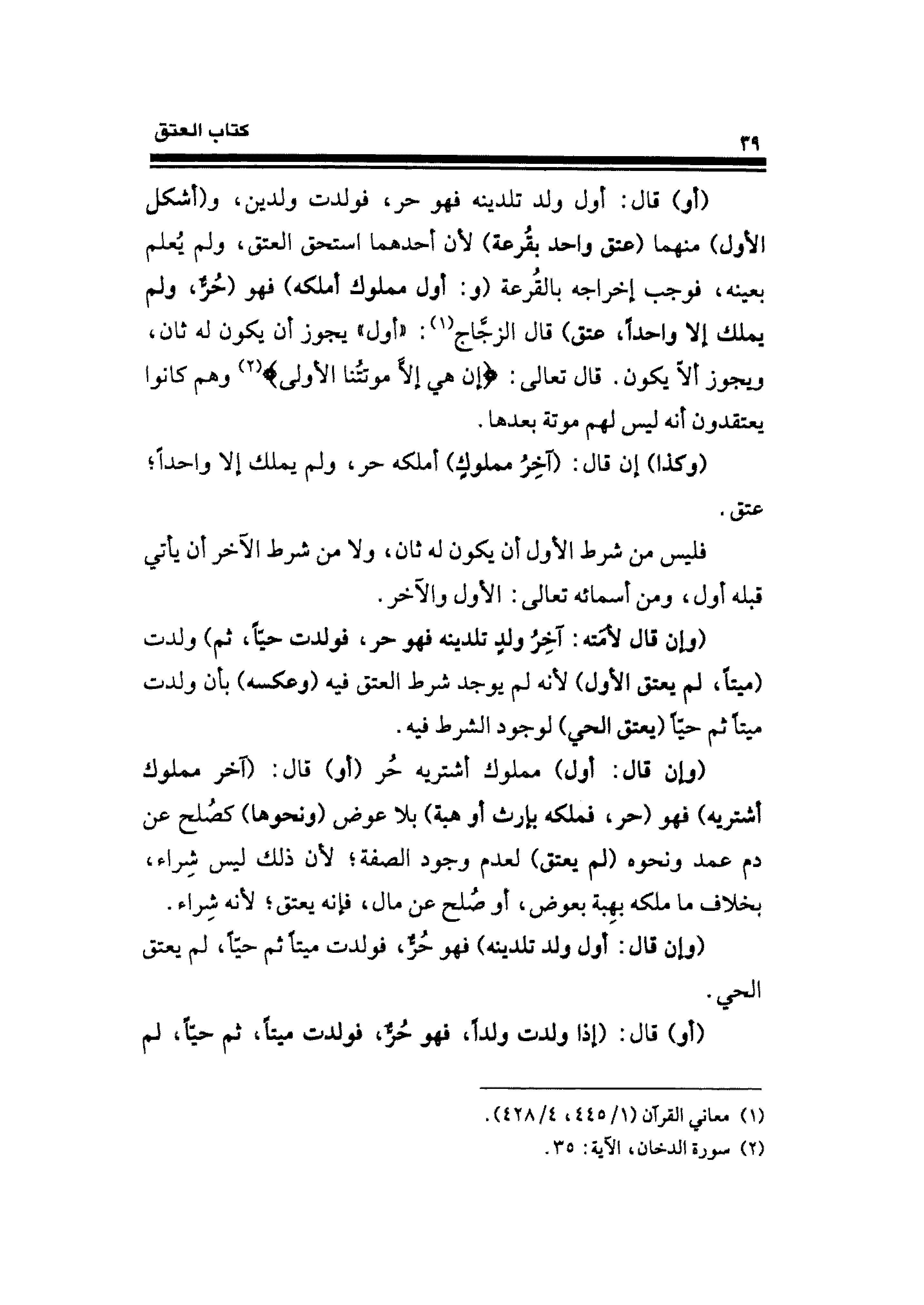 (أو) قال: أول ولد تلدينه فهو حر، فولدت ولدين، و (أشكل الأول) منهما (عتق واحد بقُرعة) لأن أحدهما استحق العتق، ولم يُعلم بعينه، فوجب إخراجه بالقُرعة (و: أول مملوك أملكه) فهو (حُرٌّ، ولم يملك إلَّا واحدًا، عتق) قال الزجَّاج (¬١): "أول" يجوز أن يكون له ثان، ويجوز ألّا يكون. قال تعالى: {إِنْ هِيَ إِلَّا مَوْتَتُنَا الْأُولَى} (¬٢) وهم كانوا يعتقدون أنَّه ليس لهم موتة بعدها.