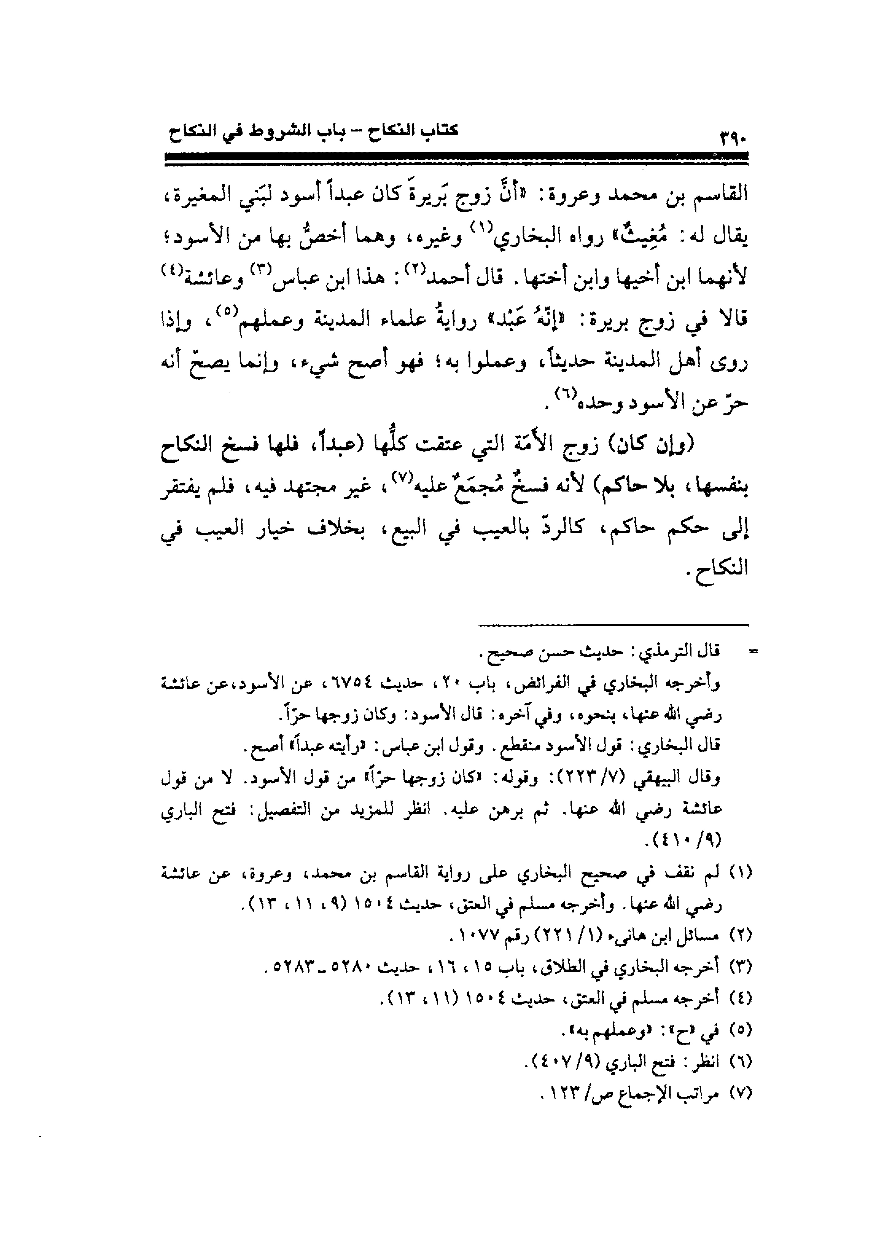 القاسم بن محمد وعروة: "أنَّ زوج بَريرةَ كان عبدًا أسود لبَني المغيرة، يقال له: مُغِيثٌ" رواه البخاري (¬١) وغيره، وهما أخصُّ بها من الأسود؛ لأنهما ابن أخيها وابن أختها. قال أحمد (¬٢): هذا ابن عباس (¬٣) وعائشة (¬٤) قالا في زوج بريرة: "إنّهُ عَبْد" روايةُ علماء المدينة وعملهم (¬٥)، وإذا روى أهل المدينة حديثًا، وعملوا به؛ فهو أصح شيء، وإنما يصحّ أنه حرّ عن الأسود وحده (¬٦).