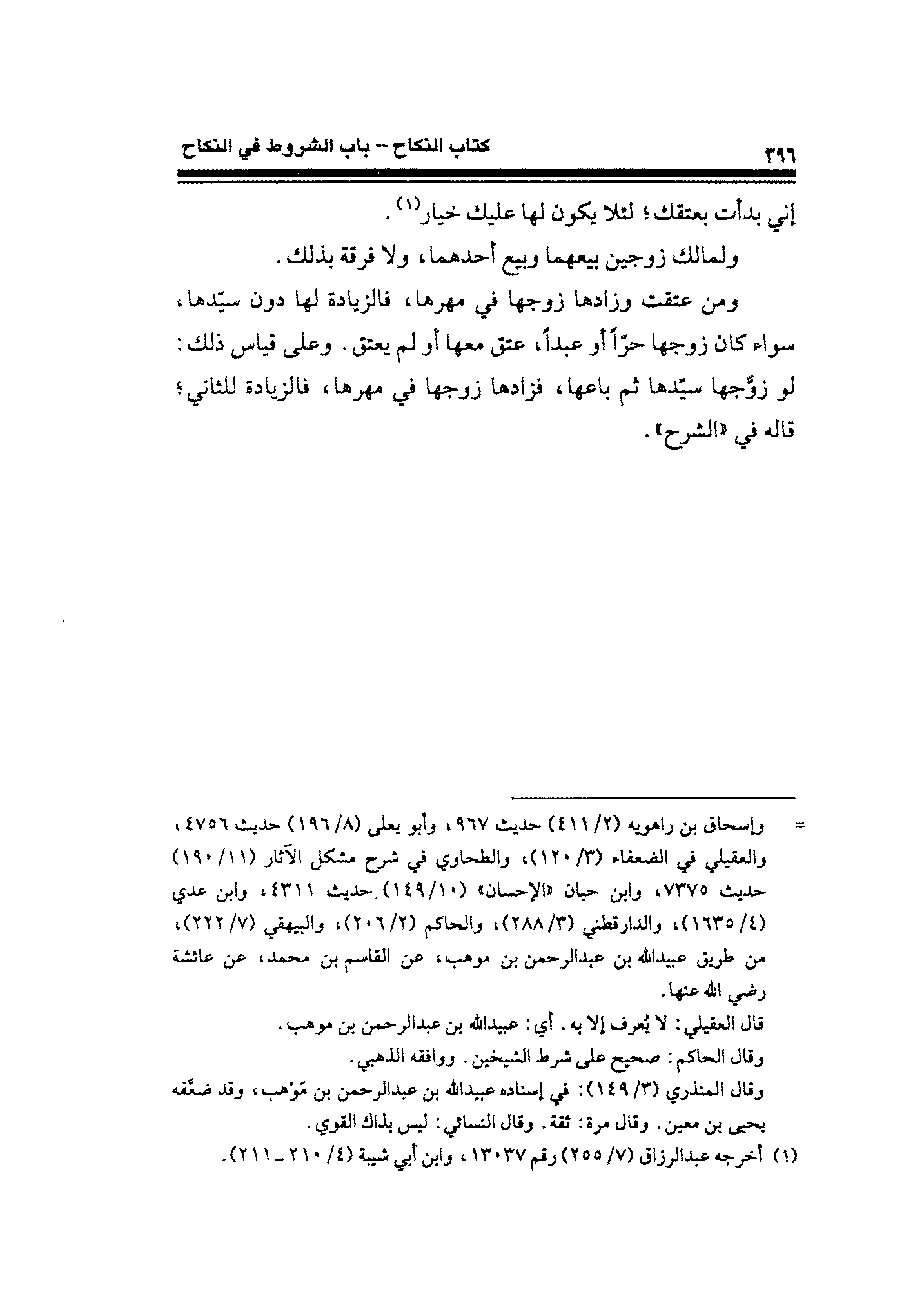 = وإسحاق بن راهويه (٢/ ٤١١) حديث ٩٦٧، وأبو يعلى (٨/ ١٩٦) حديث ٤٧٥٦، والعقيلي في الضعفاء (٣/ ١٢٠)، والطحاوي في شرح مشكل الآثار (١١/ ١٩٠) حديث ٧٣٧٥، وابن حبان "الإحسان" (١٠/ ١٤٩). حديث ٤٣١١، وابن عدي (٤/ ١٦٣٥)، والدارقطني (٣/ ٢٨٨)، والحاكم (٢/ ٢٠٦)، والبيهقي (٧/ ٢٢٢)، من طريق عبيد الله بن عبد الرحمن بن موهب، عن القاسم بن محمد، عن عائشة رضي الله عنها.
