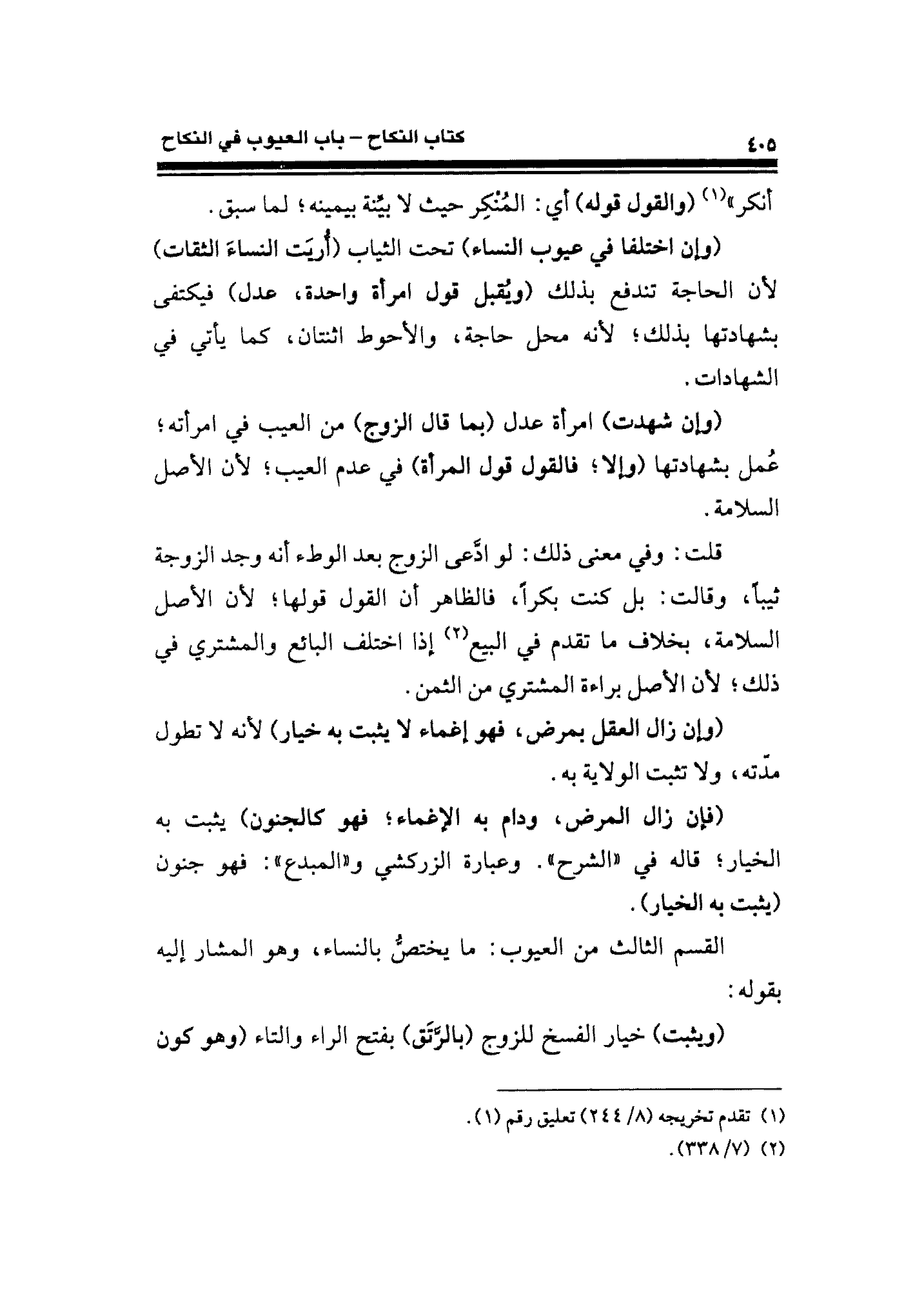 (وإن اختلفا في عيوب النساء) تحت الثياب (أُريَت النساءَ الثقات) لأن الحاجة تندفع بذلك (ويُقبل قول امرأة واحدة، عدل) فيكتفى بشهادتها بذلك؛ لأنه محل حاجة، والأحوط اثنتان، كما يأتي في الشهادات.