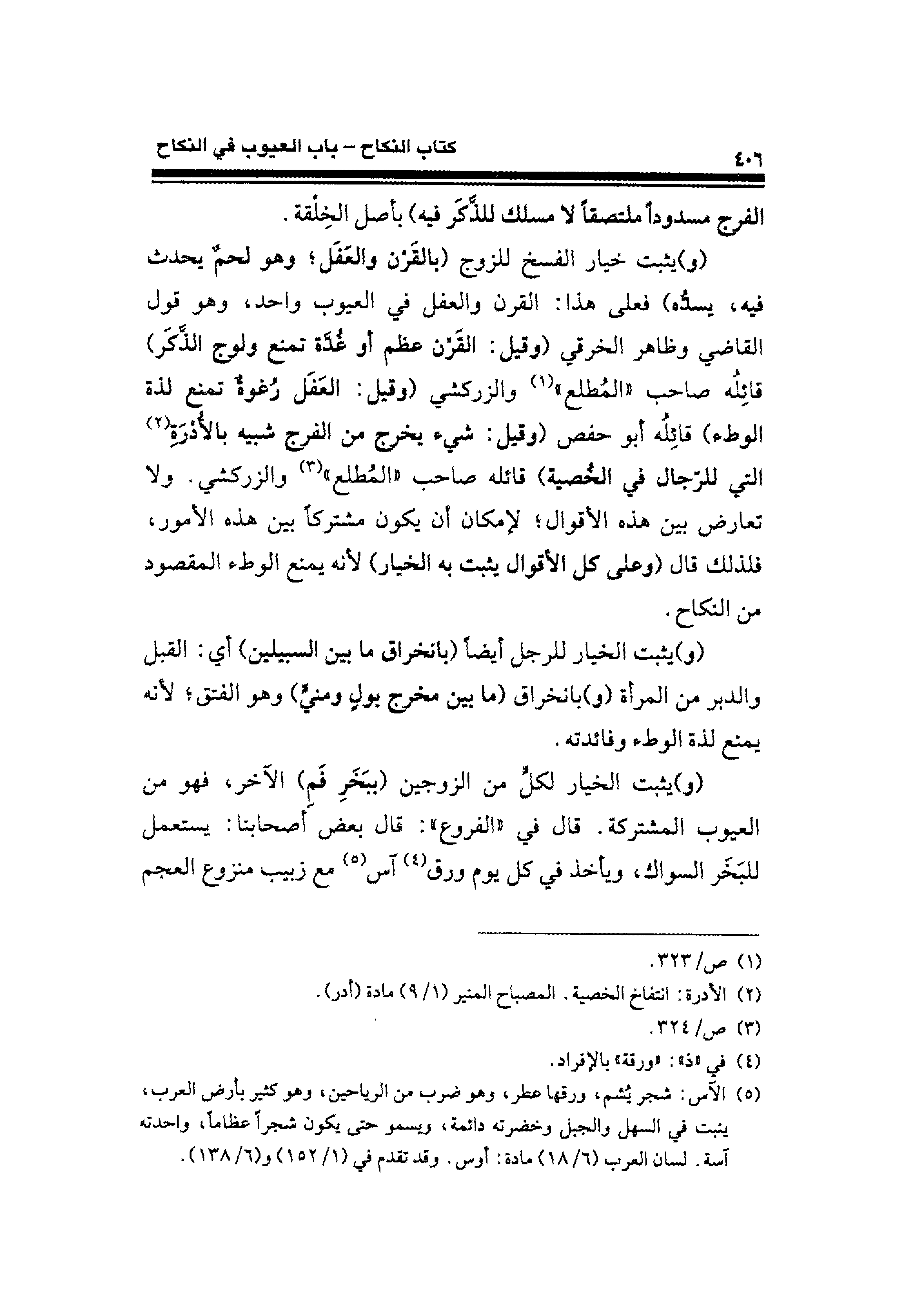 (و) يثبت خيار الفسخ للزوج (بالقَرن والعَفَل؛ وهو لحمٌ يحدث فيه، يسدُّه) فعلى هذا: القرن والعفل في العيوب واحد، وهو قول القاضي وظاهر الخرقي (وقيل: القَرن عظم أو غُدَّة تمنع ولوج الذكر) قائِلُه صاحب"المُطلع" (¬١) والزركشي (وقيل: العَفَل رُغوةٌ تمنع لذة الوطء) قائِله أبو حفص (وقيل: شيء يخرج من الفرج شبيه بالأُدْرَةِ (¬٢) التي للرّجال في الخُصية) قائله صاحب "المُطلع" (¬٣) والزركشي. ولا تعارض بين هذه الأقوال؛ لإمكان أن يكون مشتركًا بين هذه الأمور، فلذلك قال (وعلى كل الأقوال يثبت به الخيار) لأنه يمنع الرطء المقصود من النكاح.