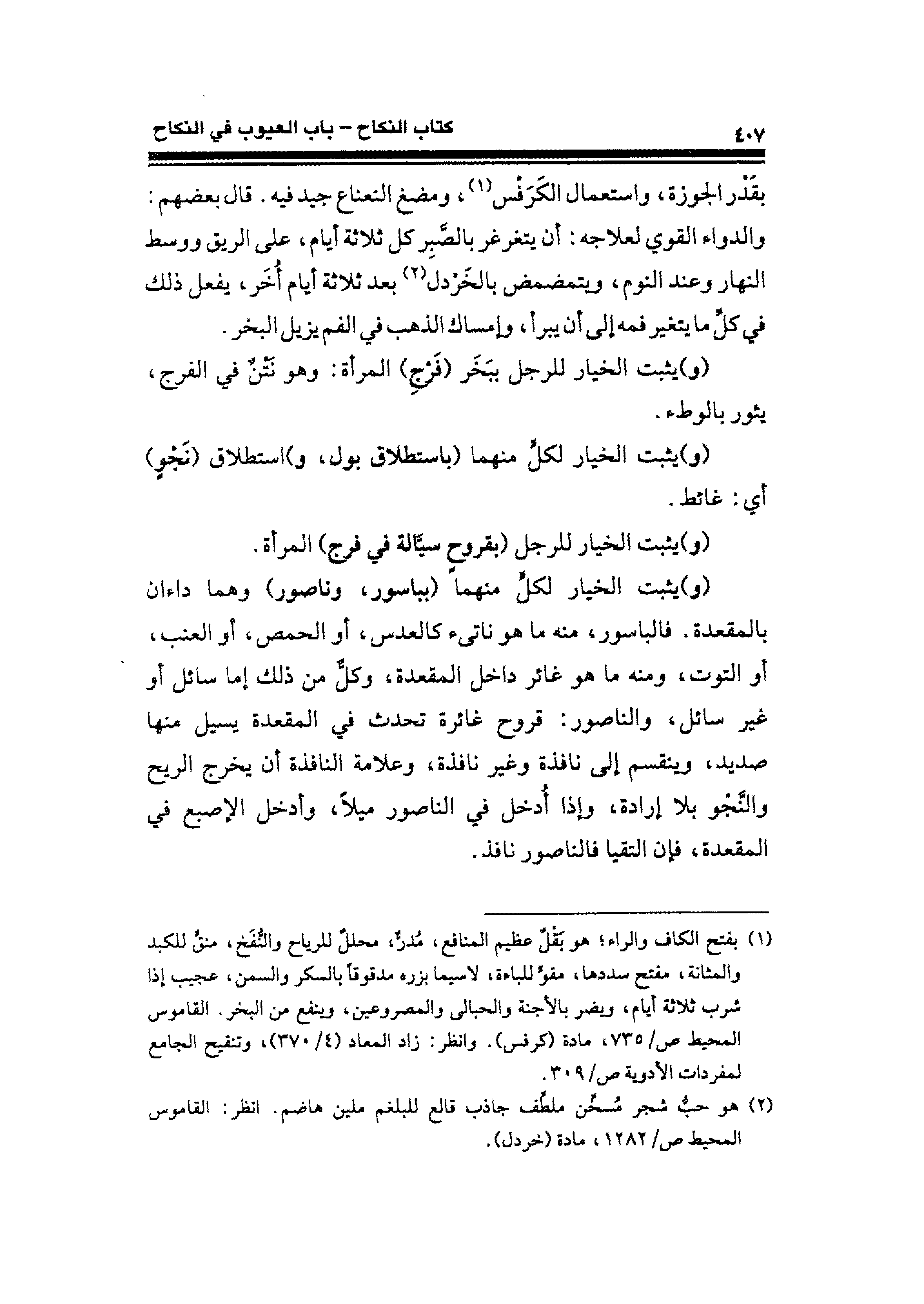 (¬١) بفتح الكاف والراء؛ هو بقْلٌ عظيم المنافع، مُدرٌّ، محللٌ للرياح والنفخ، منق للكبد والمثانة، مفتح سددها، مقو للباءة، لاسيما بزره مدقوقًا بالسكر والسمن، عجيب إذا شرب ثلاثة أيام، ويضر بالأجنة والحبالى والمصروعين، وينفع من البخر. القاموس المحيط ص / ٧٣٥، مادة (كرفس). وانظر: زاد المعاد (٤/ ٣٧٠)، وتنقيح الجامع لمفردات الأدوية ص / ٣٠٩.