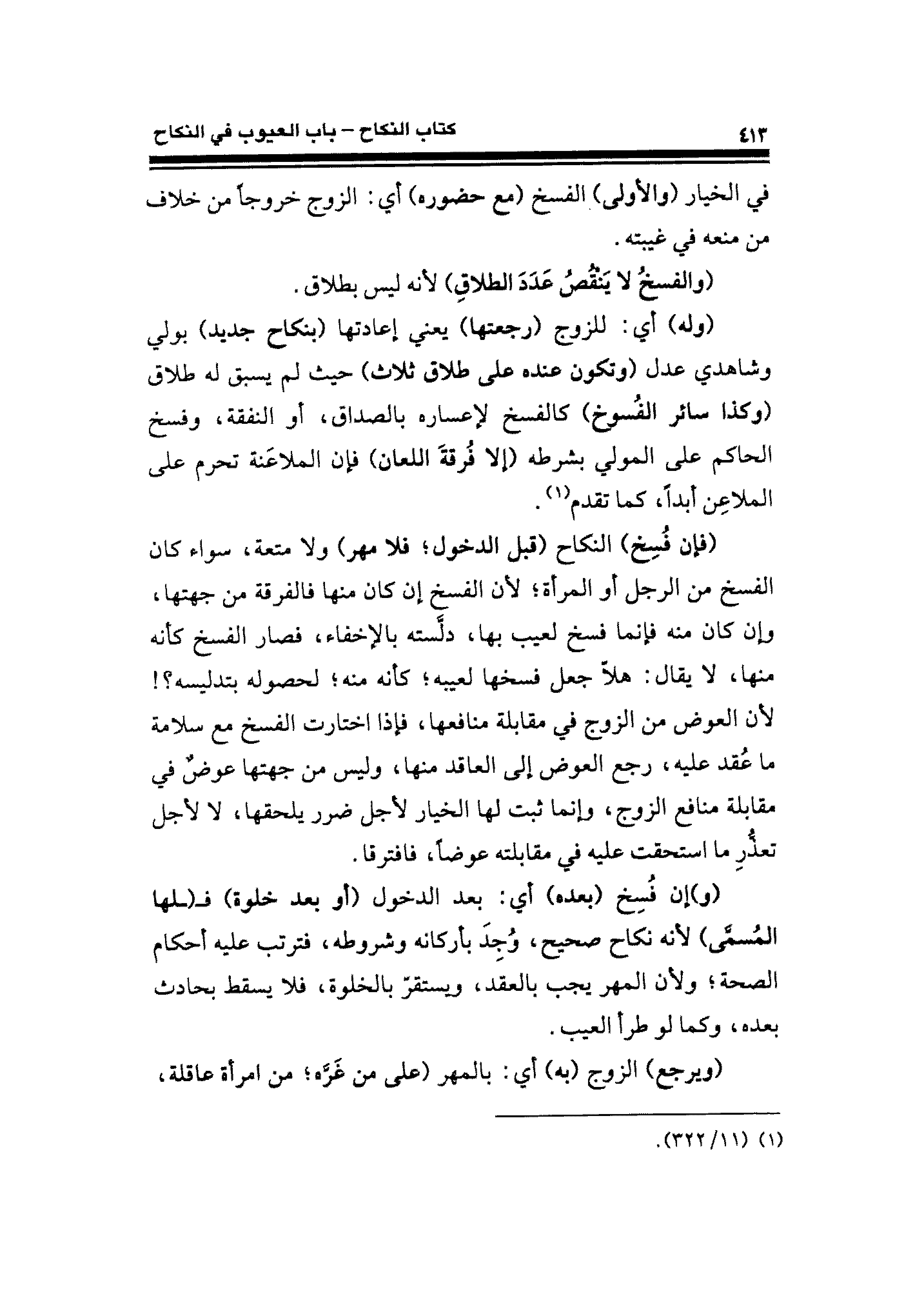 (فإن فُسِخ) النكاح (قبل الدخول؛ فلا مهر) ولا متعة، سواء كان الفسخ من الرجل أو المرأة؛ لأن الفسخ إن كان منها فالفرقة من جهتها، وإن كان منه فإنما فسخ لعيب بها، دلَّسته بالإخفاء، فصار الفسخ كأنه منها، لا يقال: هلا جعل فسخها لعيبه؛ كأنه منه؛ لحصوله بتدليسه؟! لأن العوض من الزوج في مقابلة منافعها، فإذا اختارت الفسخ مع سلامة ما عُقد عليه، رجع العوض إلى العاقد منها، وليس من جهتها عوضٌ في مقابلة منافع الزوج، وإنما ثبت لها الخيار لأجل ضرر يلحقها، لا لأجل تعذُّرِ ما استحقت عليه في مقابلته عوضًا، فافترقا.