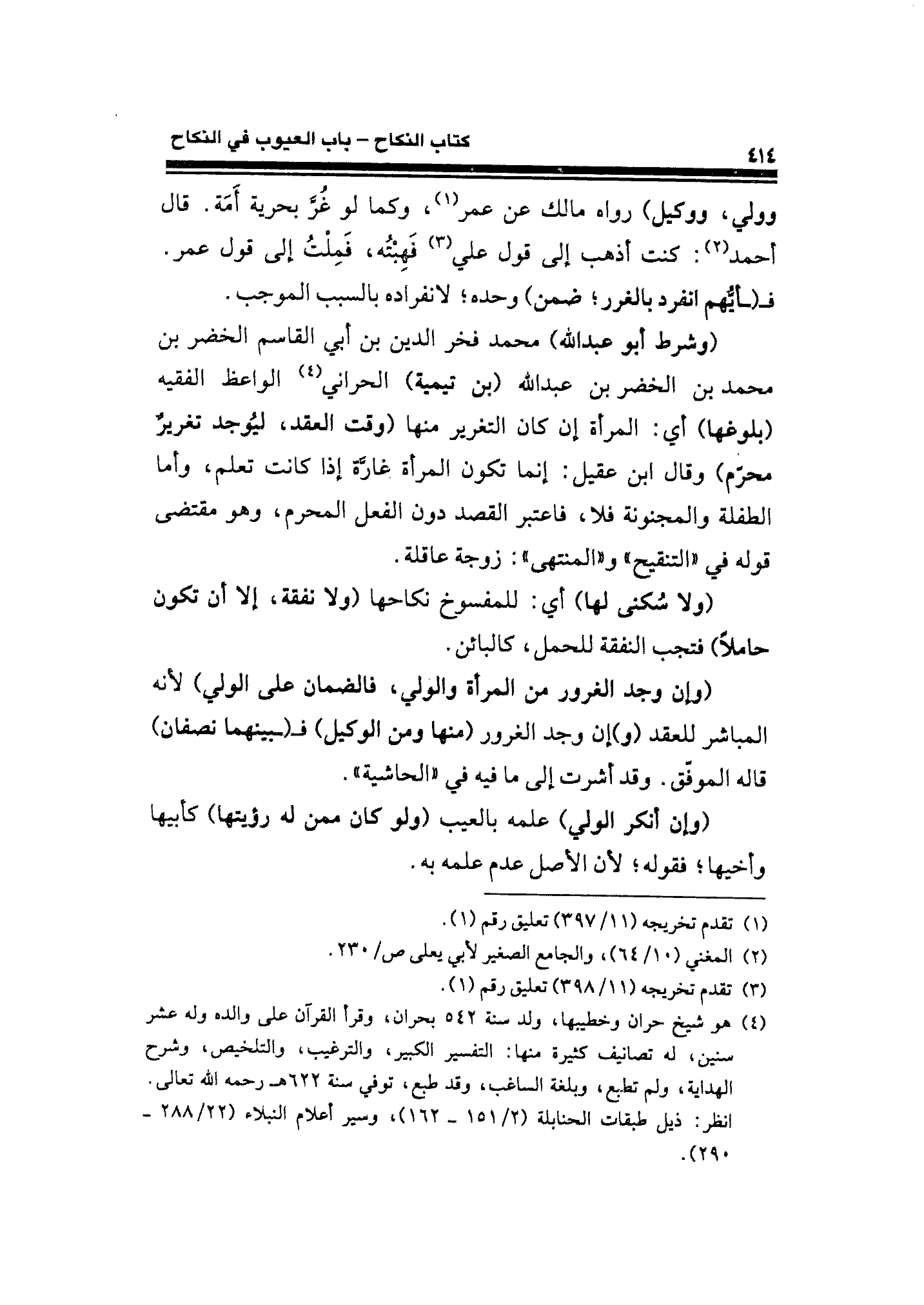 (وشرط أبو عبد الله) محمد فخر الدين بن أبي القاسم الخضر بن محمد بن الخضر بن عبد الله (بن تيمية) الحراني (¬٤) الواعظ الفقيه (بلوغها) أي: المرأة إن كان التغرير منها (وقت العقد، ليُوجد تغريرٌ محرّم) وقال ابن عقيل: إنما تكون المرأة غارَّة إذا كانت تعلم، وأما الطفلة والمجنونة فلا، فاعتبر القصد دون الفعل المحرم، وهر مقتضى قوله في "التنقيح" و"المنتهى": زوجة عاقلة.
