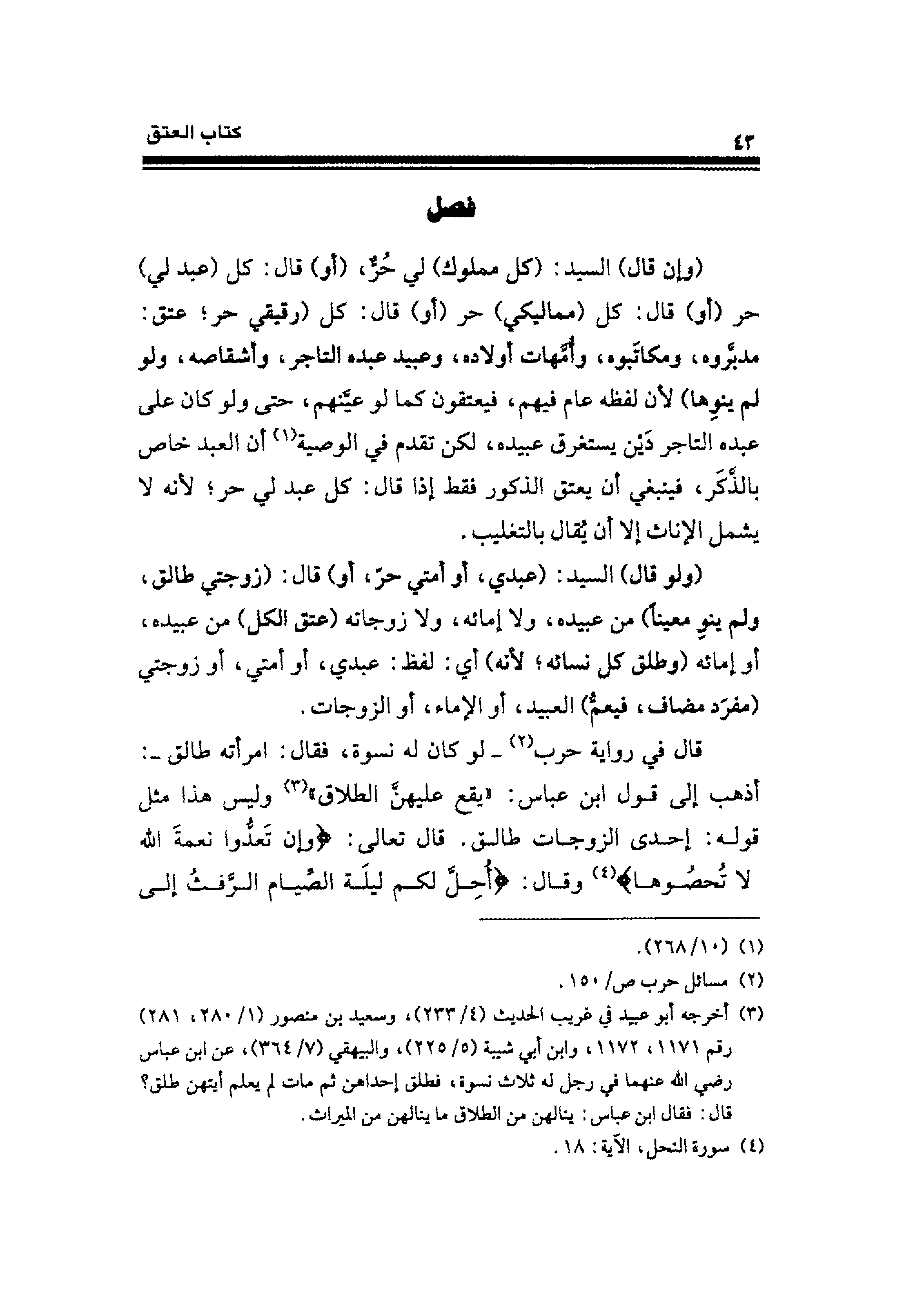 (ولو قال) السيد: (عبدي، أو أمتي حرّ، أو) قال: (زوجتي طالق، ولم ينوِ معينًا) من عبيده، ولا إمائه، ولا زوجاته (عتق الكل) عن عبيده، أو إمائه (وطلق كل نسائه؛ لأنه) أي: لفظ: عبدي، أو أمتي، أو زوجتي (مفرَد مضاف، فيعمُّ) العبيد، أو الإماء، أو الزوجات.