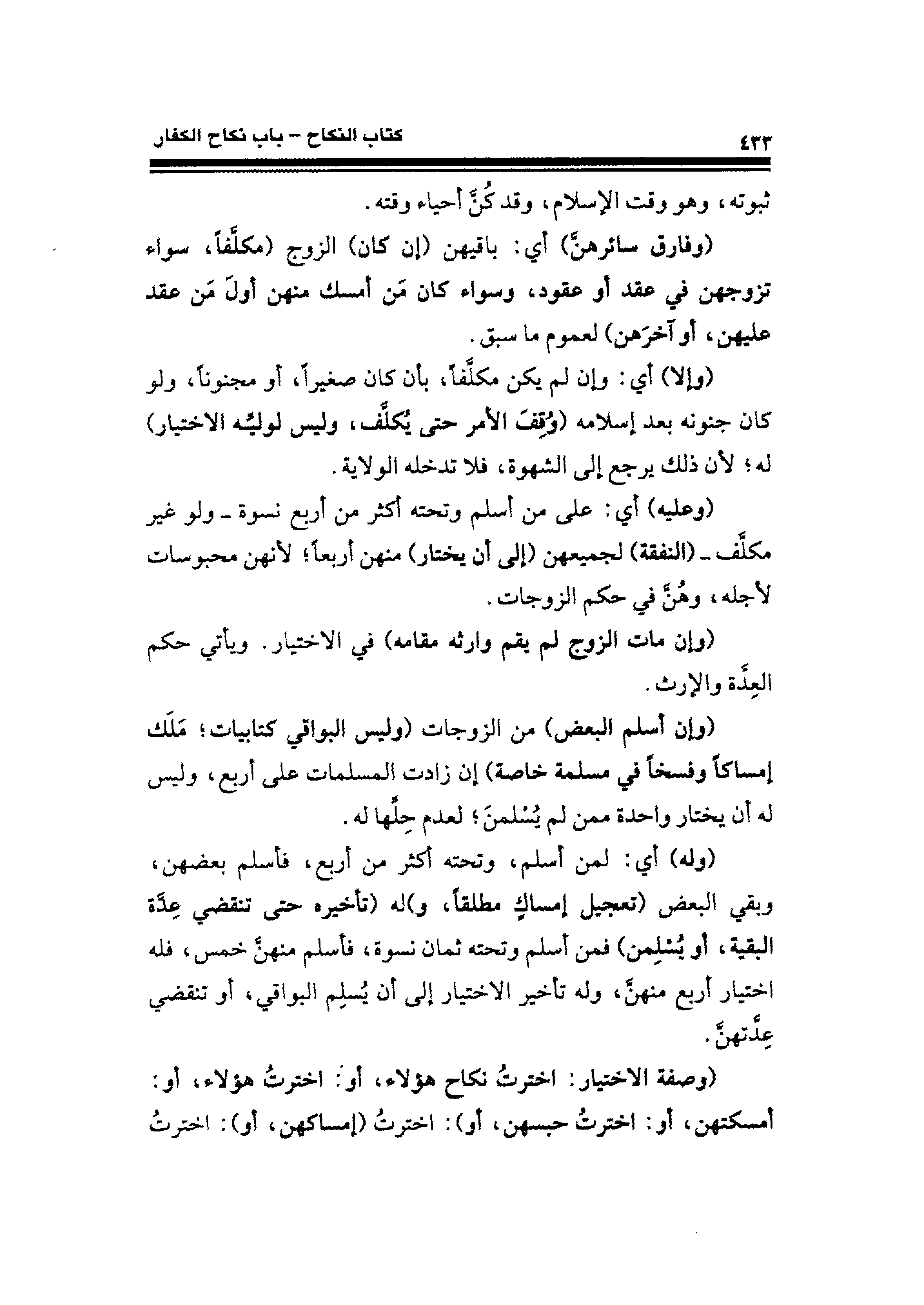 (وعليه) أي: على من أسلم وتحته أكثر من أربع نسوة -ولو غير مكلَّف- (النفقة) لجميعهن (إلى أن يختار) منهن أربعًا؛ لأنهن محبوسات لأجله، وهُنَّ في حكم الزوجات.