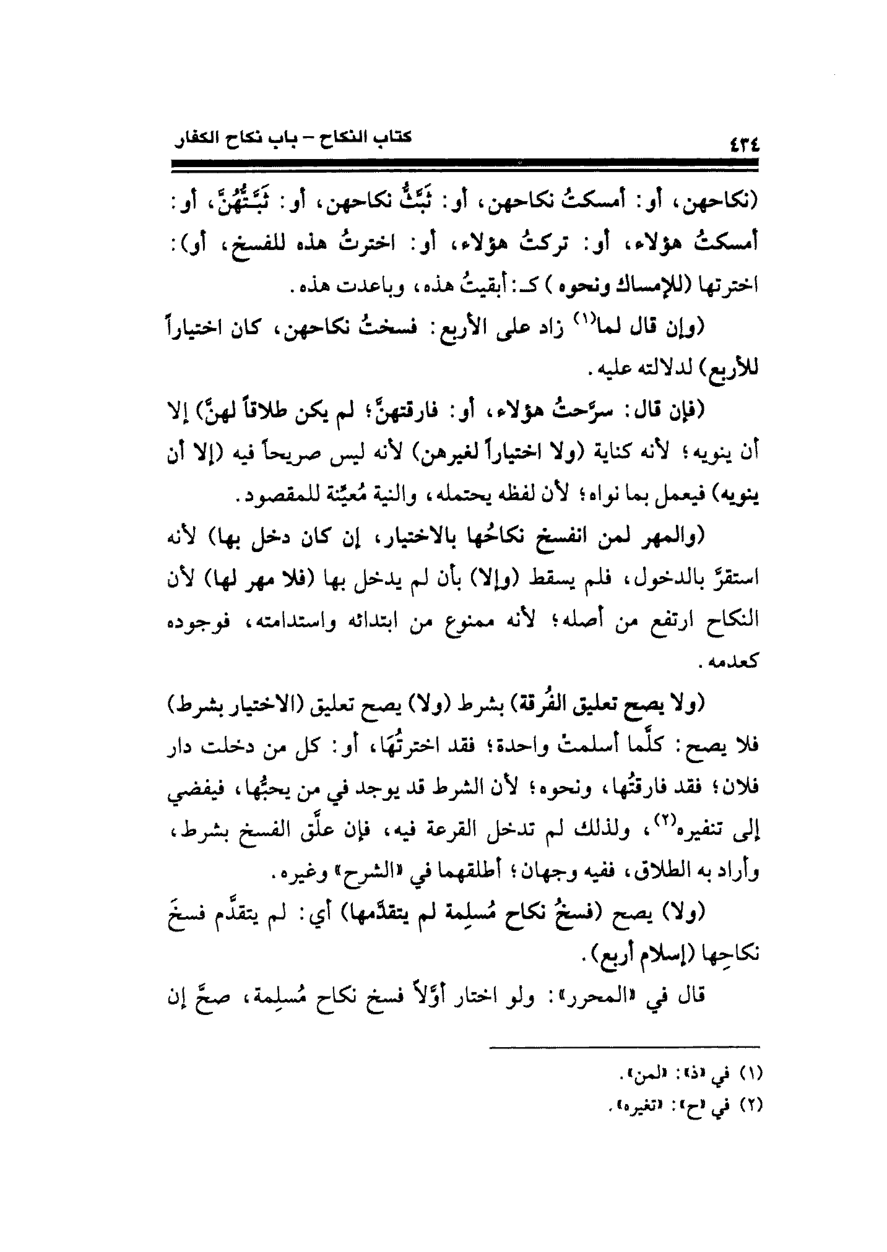قال في "المحرر": ولو اختار أوَّلًا فسخ نكاح مُسلِمة، صحَّ إن