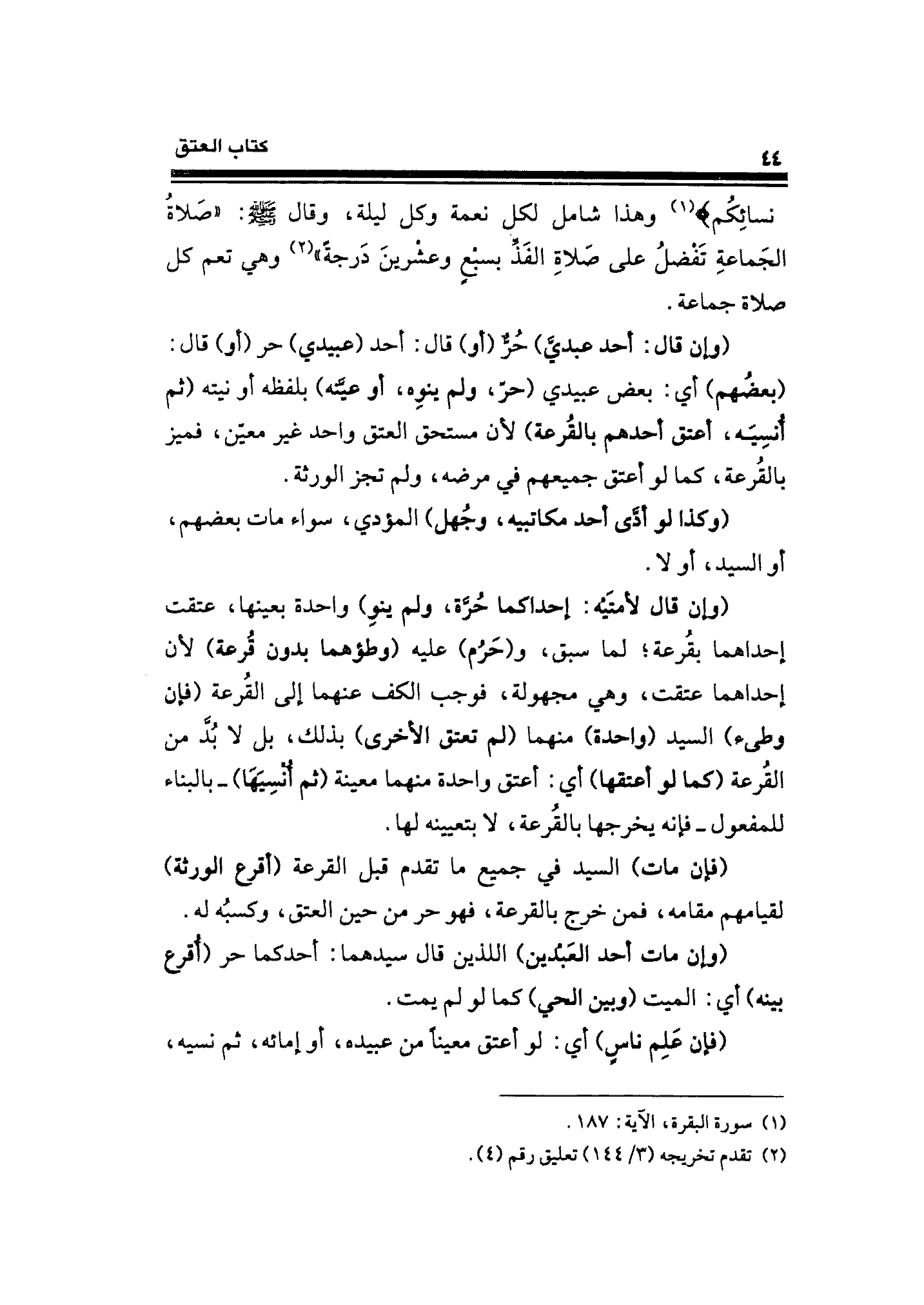 نِسَائِكُمْ} (¬١) وهذا شامل لكل نعمة وكل ليلة، وقال - صلى الله عليه وسلم -: "صَلاةُ الجَماعةِ تَفضلُ على صَلاةِ الفَذِّ بسبْعٍ وعشْرينَ دَرجةً" (¬٢) وهي تعم كل صلاة جماعة.