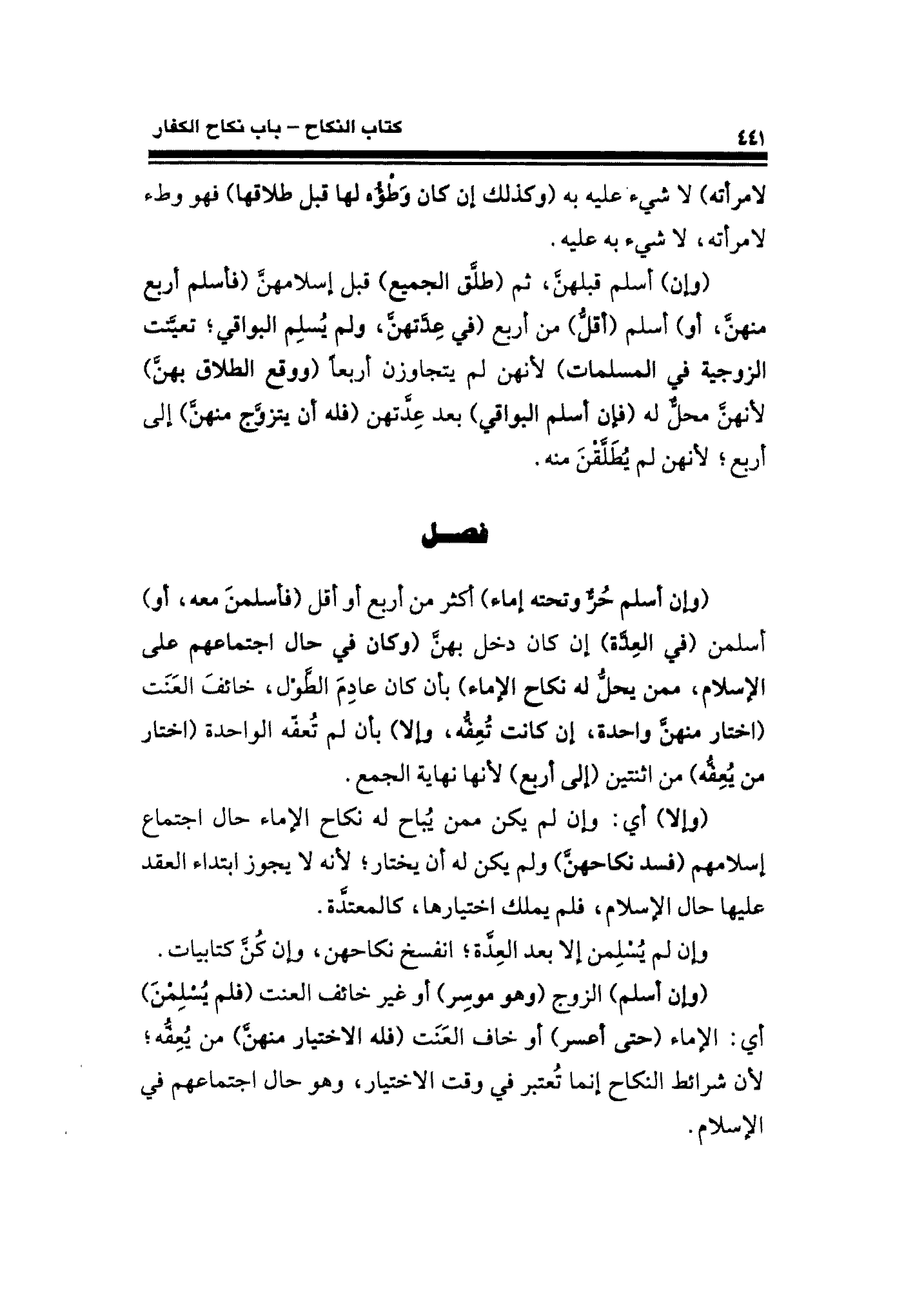 (وإلا) أي: وإن لم يكن عمن يُباح له نكاح الإماء حال اجتماع إسلامهم (فسد نكاحهنَّ) ولم يكن له أن يختار؛ لأنه لا يجوز ابتداء العقد عليها حال الإسلام، فلم يملك اختيارها، كالمعتدَّة.