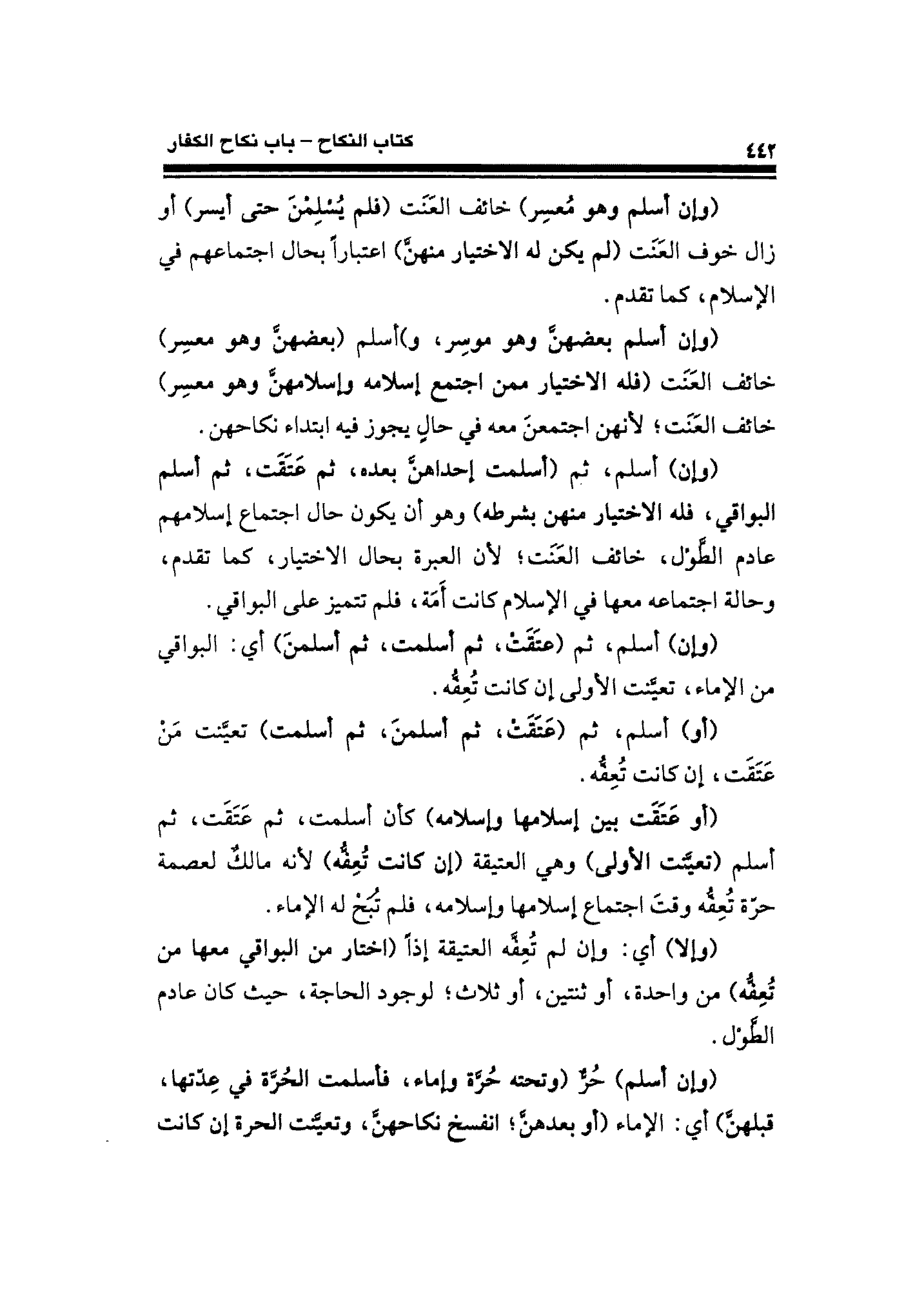 (وإن أسلم بعضهنَّ وهو موسِر، و) أسلم (بعضهنَّ وهو معسِر) خائف العَنَت (فله الاختيار ممن اجتمع إسلامه وإسلامهنَّ وهو معسِر) خائف العَنَت؛ لأنهن اجتمعنَ معه في حالٍ يجوز فبه ابتداء نكاحهن.