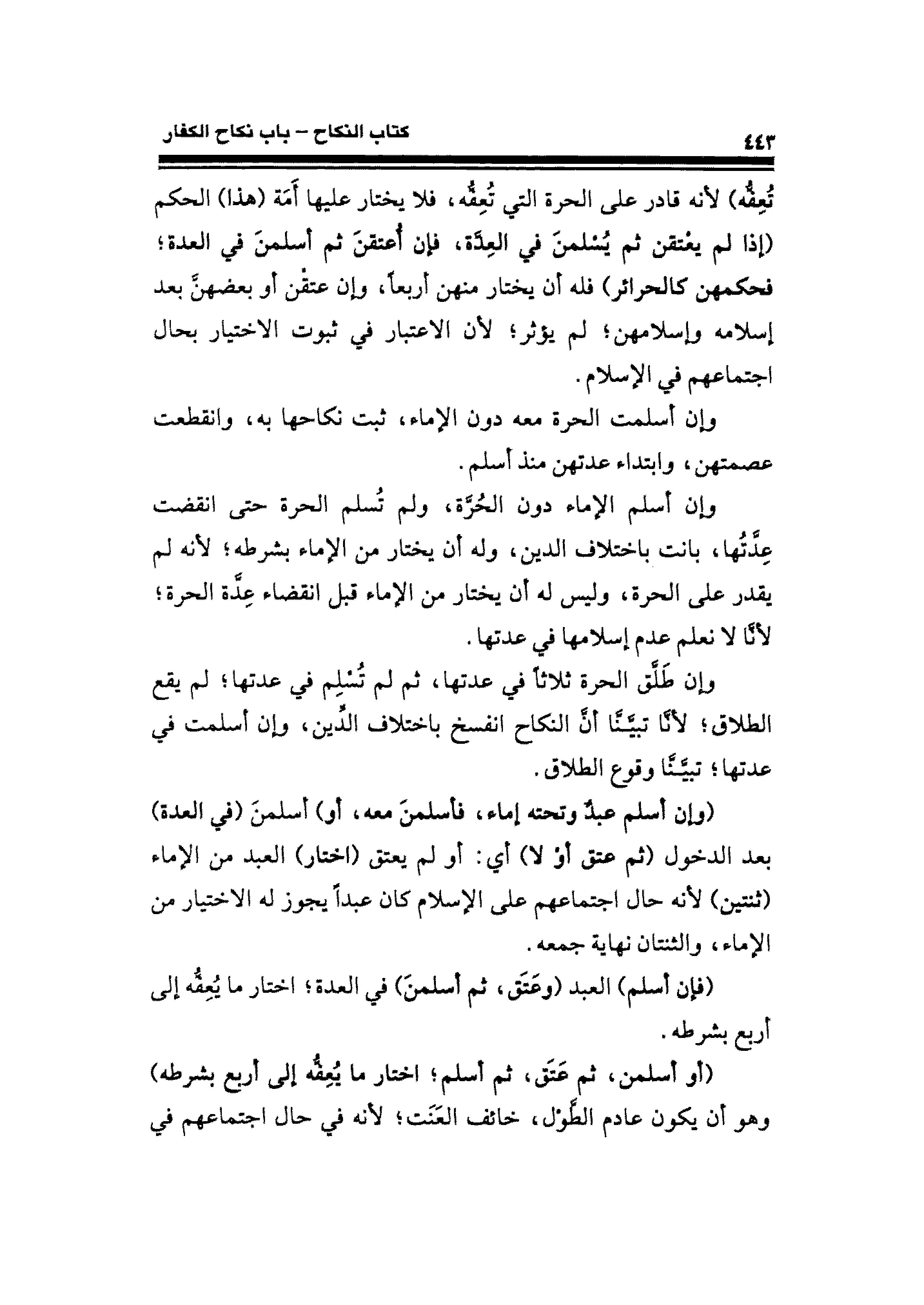 وإن أسلم الإماء دون الحُرَّة، ولم تُسلم الحرة حتى انقضت عِدَّتُها، بانت باختلاف الدين، وله أن يختار من الإماء بشرطه؛ لأنه لم يقدر على الحرة، وليس له أن يختار من الإماء قبل انقضاء عِدَّة الحرة؛ لأنَّا لا نعلم عدم إسلامها في عدتها.