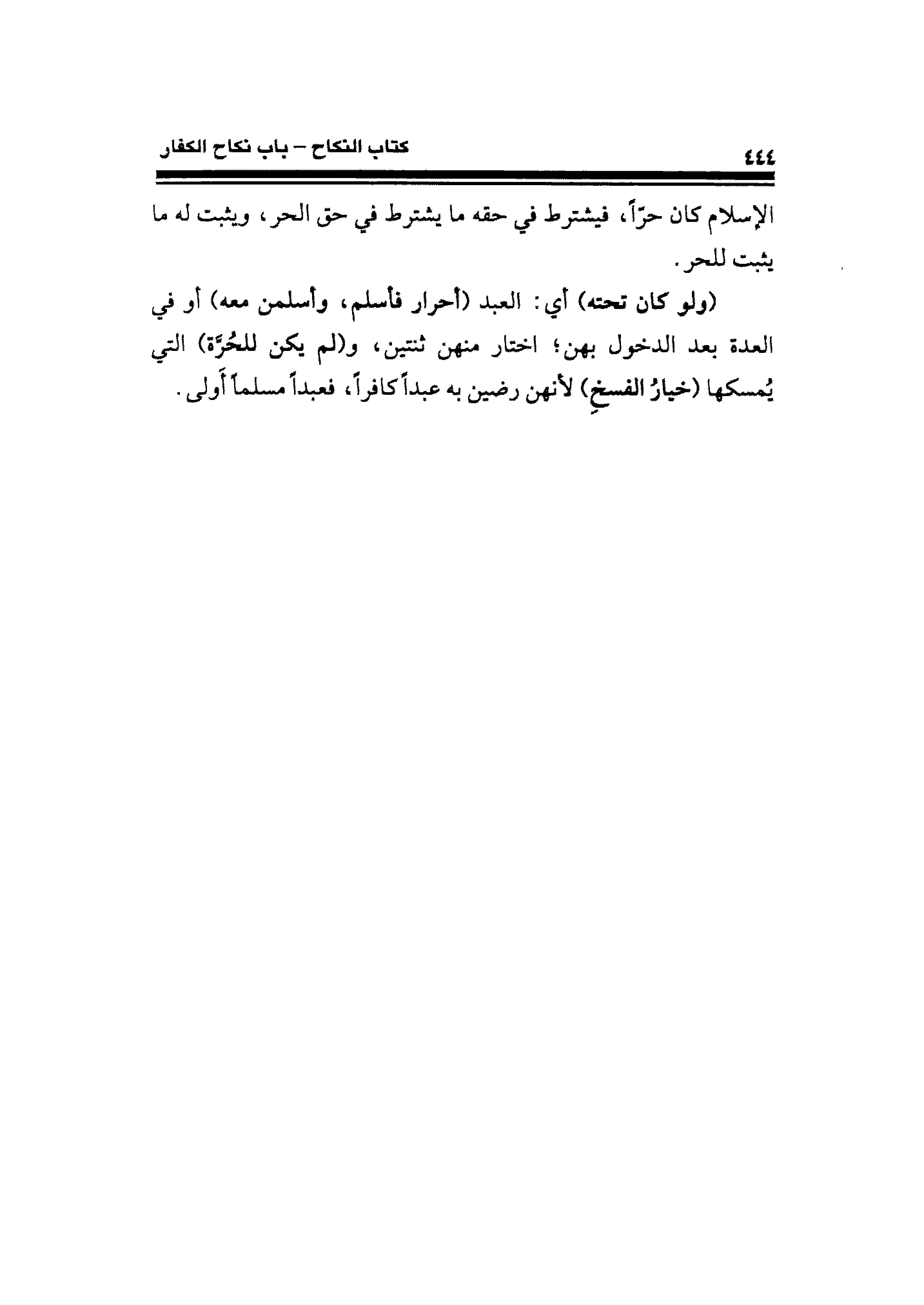 (ولو كان تحته) أي: العبد (أحرار فأسم، وأسلمن معه) أو في العدة بعد الدخول بهن؛ اختار منهن ثنتين، و (لم يكن للحُرَّة) التي يُمسكها (خيارُ الفسخِ) لأنهن رضين به عبدًا كافرًا، فعبدًا مسلمًا أَولى.