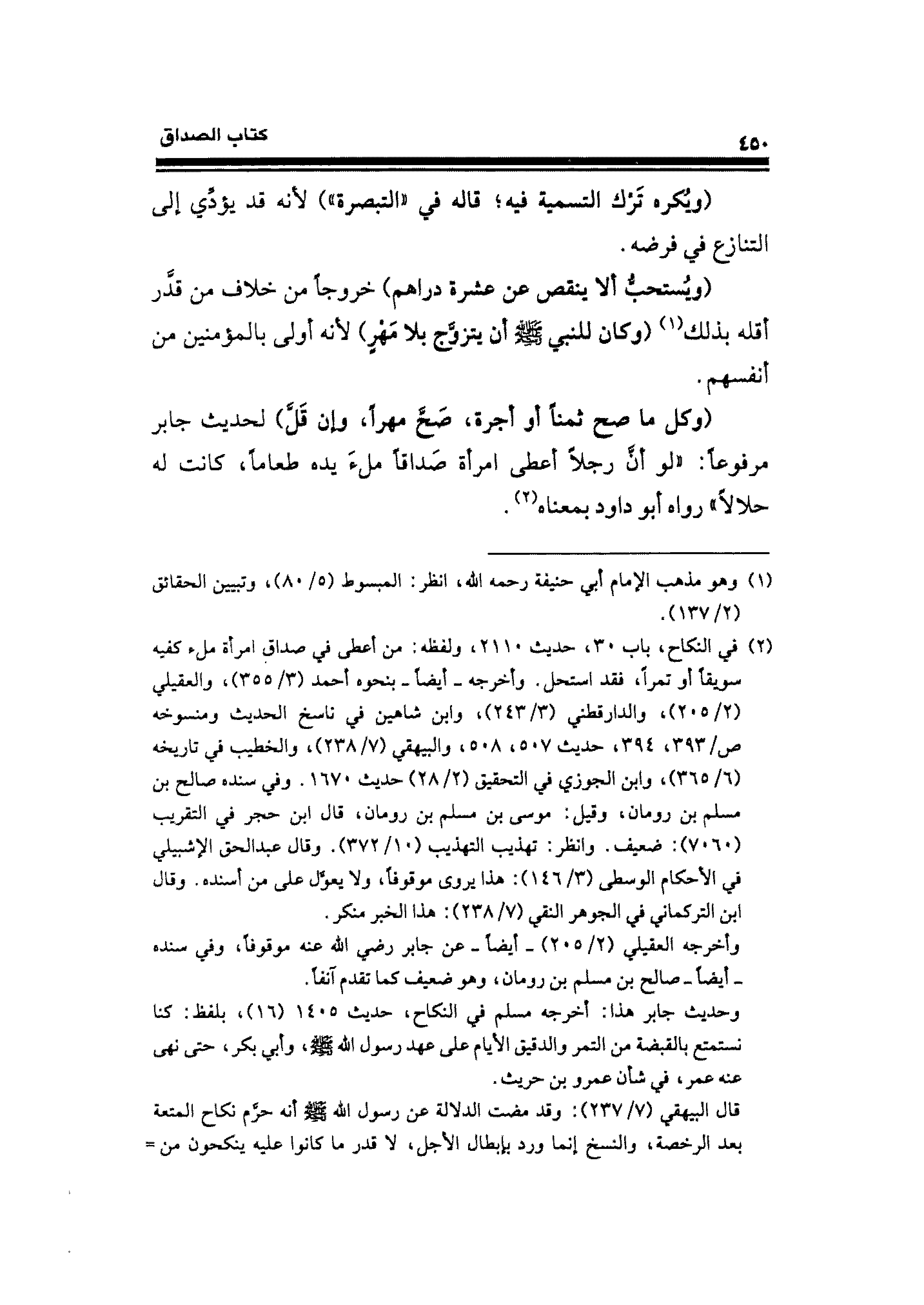 (¬٢) في النكاح، باب ٣٠، حديث ٢١١٠، ولفظه: من أعطى في صداق امرأة ملء كفيه سويقًا أو تمرًا، فقد استحل. وأخرجه -أيضًا- بنحوه أحمد (٣/ ٣٥٥)، والعقيلي (٢/ ٢٠٥)، والدارقطني (١/ ٢٤٣)، وابن شاهين في ناسخ الحديث ومنسوخه ص / ٣٩٣، ٣٩٤، حديث ٥٠٧، ٥٠٨، والبيهقي (٧/ ٢٣٨)، والخطيب في تاريخه (٦/ ٣٦٥)، وابن الجوزي في التحقيق (٢/ ٢٨) حديث ١٦٧٠. وفي سنده صالح بن مسلم بن رومان، وقيل: موسى بن مسلم بن رومان، قال ابن حجر في التقريب (٧٠٦٠): ضعيف. وانظر: تهذيب التهذيب (١٠/ ٣٧٢). وقال عبد الحق الإشبيلي في الأحكام الوسطى (٣/ ١٤٦): هذا يروى موقوفًا، ولا يعوَّل على من أسنده. وقال ابن التركماني في الجوهر النقي (٧/ ٢٣٨) هذا الخبر منكر.