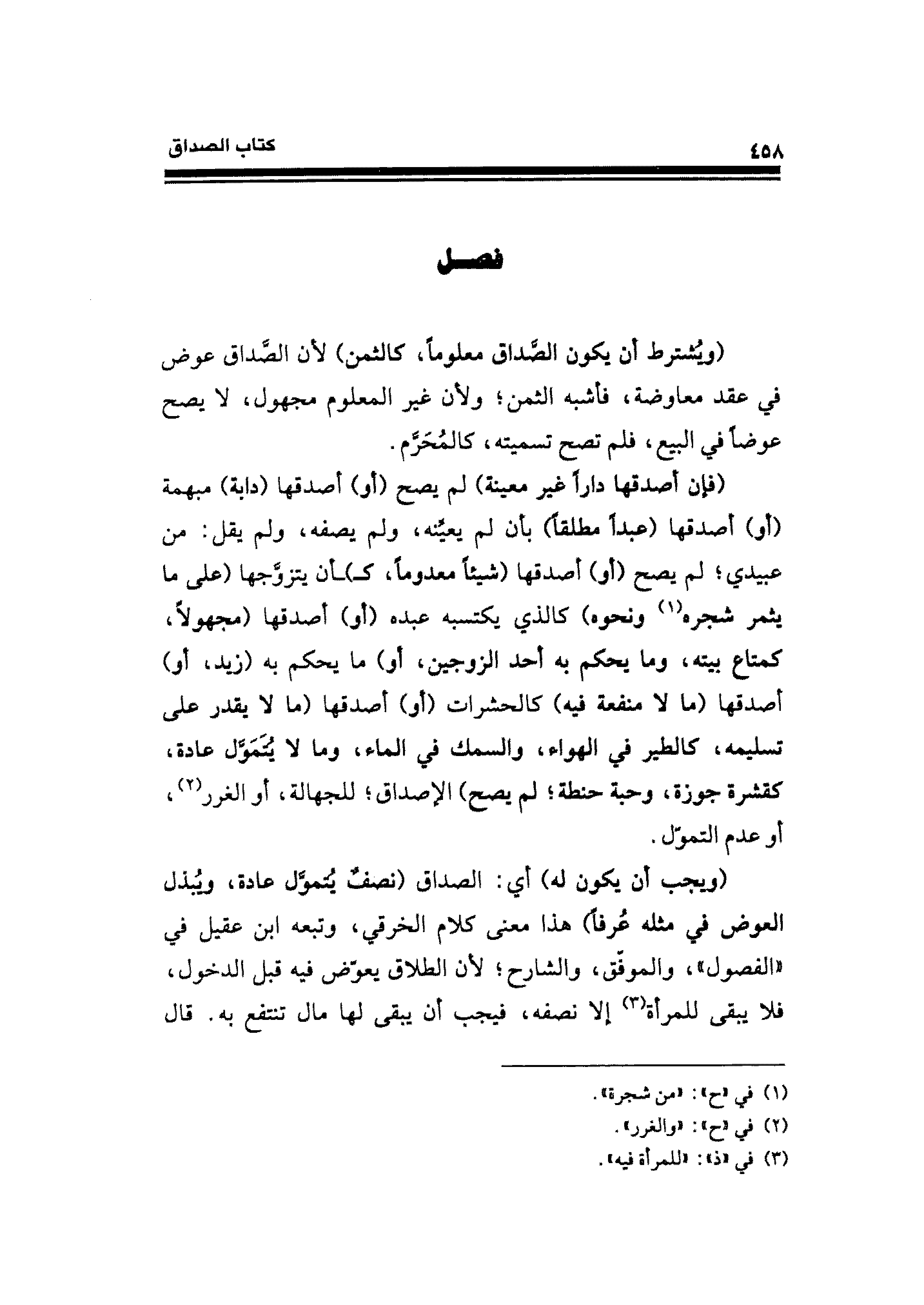 (فإن أصدقها دارًا غير معينة) لم يصح (أو) أصدقها (دابة) مبهمة (أو) أصدقها (عبدًا مطلقًا) بأن لم يعيِّنه، ولم يصفه، ولم يقل: من عبيدي؛ لم يصح (أو) أصدقها (شيئًا معدومًا، كـ) ـأن يتزوجها (على ما يثمر شجره (¬١) ونحوه) كالذي يكتسبه عبده (أو) أصدقها (مجهولًا، كمتاع بيته، وما يحكم به أحد الزوجين، أو) ما يحكم به (زيد، أو) أصدقها (ما لا منفعة فيه) كالحشرات (أو) أصدقها (ما لا يقدر على تسليمه، كالطير في الهواء، والسمك في الماء، وما لا يُتَمَوَّل عادة، كقشرة جوزة، وحبة حنطة؛ لم يصح) الإصداق؛ للجهالة، أو الغرر (¬٢)، أو عدم التمول.