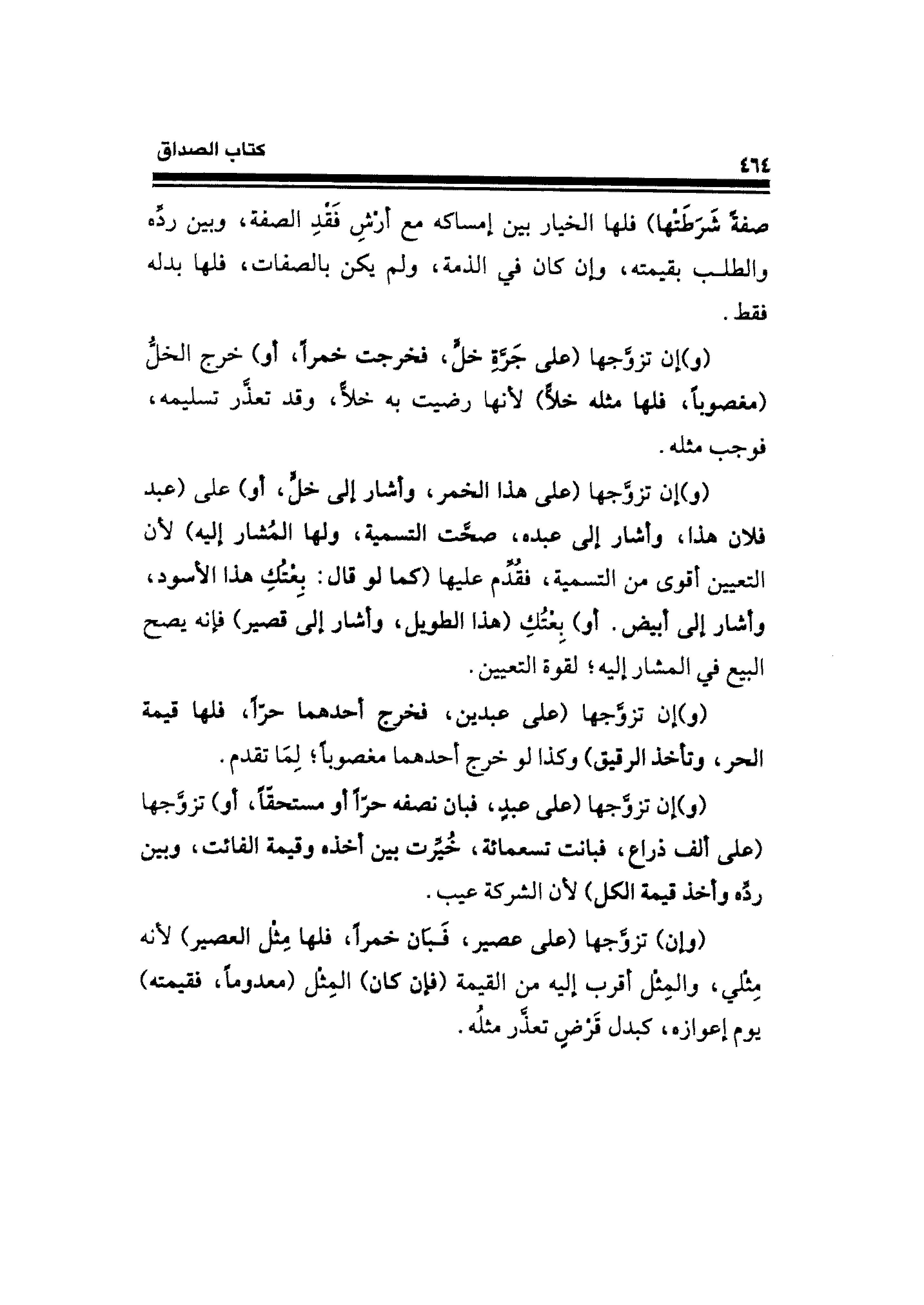 (و) إن تزوجها (على هذا الخمر، وأشار إلى خلٍّ، أو) على (عبد فلان هذا، وأشار إلى عبده، صحت التسمية، ولها المُشار إليه) لأن التعيين أقوى من التسمية، فقُدِّم عليها (كما لو قال: بِعتك هذا الأسود، وأشار إلى أبيض. أو) بِعتُكِ (بها الطويل، وأشار إلى قصير) فإنه يصح البيع في المشار إليه؛ لقوة التعيين.