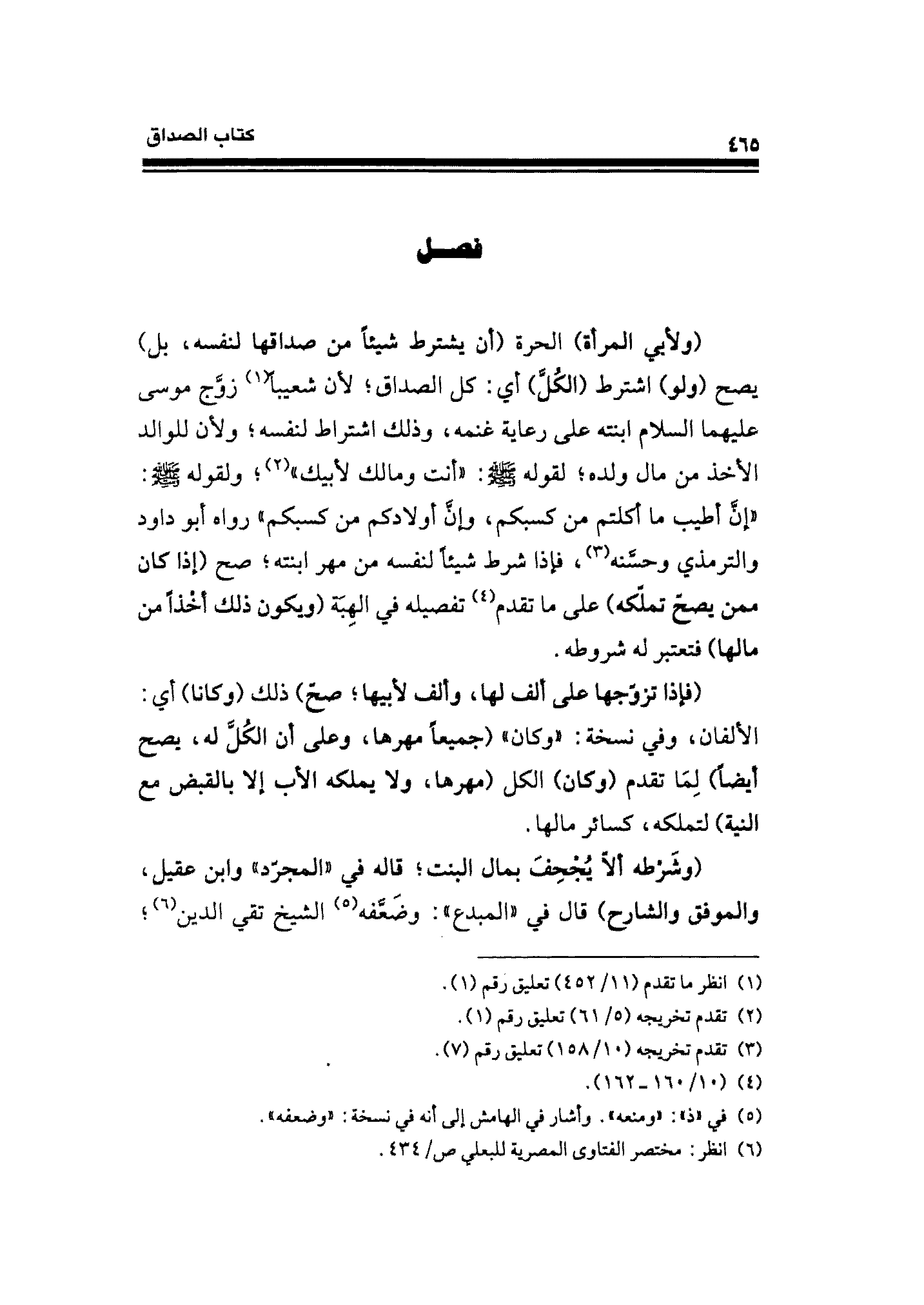 (ولأبي المرأة) الحرة (أن يشترط شيئًا من صداقها لنفسه، بل) يصح (ولو) اشترط (الكُلَّ) أي: كل الصداق؛ لأن شعيبًا (¬١) زوّج موسى عليهما السلام ابنته على رعاية غنمه، وذلك اشتراط لنفسه؛ ولأن للوالد الأخذ من مال ولده؛ لقوله - صلى الله عليه وسلم -: "أنت ومالك لأبيك" (¬٢)؛ ولقوله - صلى الله عليه وسلم -: "إن أطيب ما أكلتم من كسبكم، وإن أولادكم من كسبكم" رواه أبو داود والترمذي وحسنه (¬٣)، فإذا شرط شيئًا لنفسه من مهر ابنته؛ صح (إذا كان ممن يصحّ تملّكه) على ما تقدم (¬٤) تفصيله في الهِبَة (ويكون ذلك أخذًا من مالها) فتعتبر له شروطه.