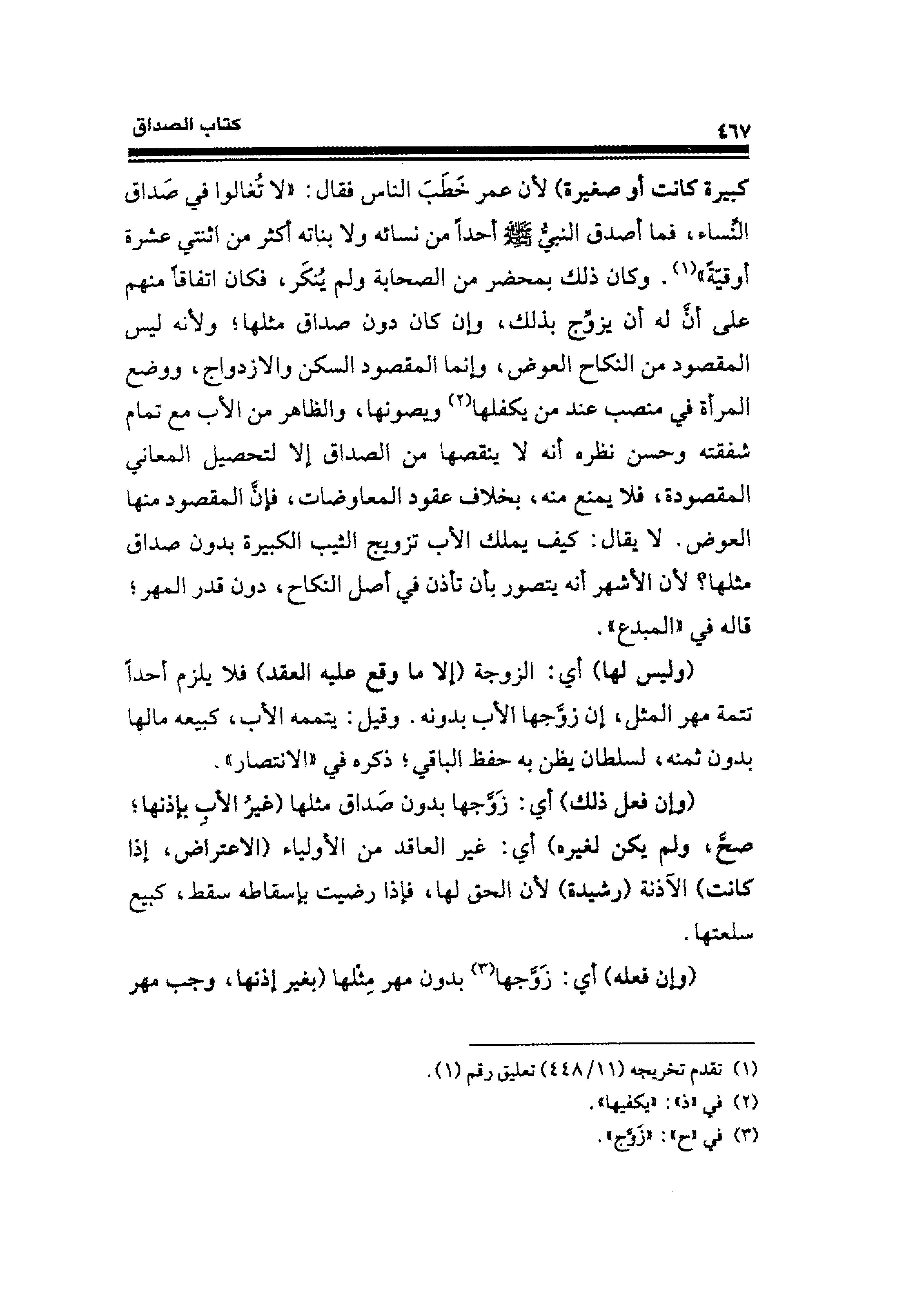 كبيرة كانت أو صغيرة) لأنَّ عمر خَطَبَ النَّاس فقال: "لا تُغالوا في صَداق النِّساء، فما أصدق النبيُّ - صلى الله عليه وسلم - أحدًا من نسائه ولا بناته أكثر من اثنتي عشرة أوقيَّةَ" (¬١). وكان ذلك بمحضر من الصّحابة ولم يُنكر، فكان اتفاقًا منهم على أنَّ له أن يزوِّج بذلك، دون كان دون صداق مثلها؛ ولأنه ليس المقصود من النكاح العوض، وإنما المقصود السكن والازدواج، ووضع المرأة في منصب عند عن يكفلها (¬٢) ويصونها، والظاهر من الأب مع تمام شفقته وحسن نظره أنَّه لا ينقصها من الصداق إلَّا لتحصيل المعاني المقصودة، فلا يمنع منه، بخلاف عقود المعاوضات، فإنَّ المقصود منها العرض. لا يقال: كيف يملك الأب تزويج الثَّيب الكبيرة بدون صداق مثلها؟ لأنَّ الأشهر أنَّه يتصور بأن تأذن في أصل النكاح، دون قدر المهر؛ قاله في "المبدع".