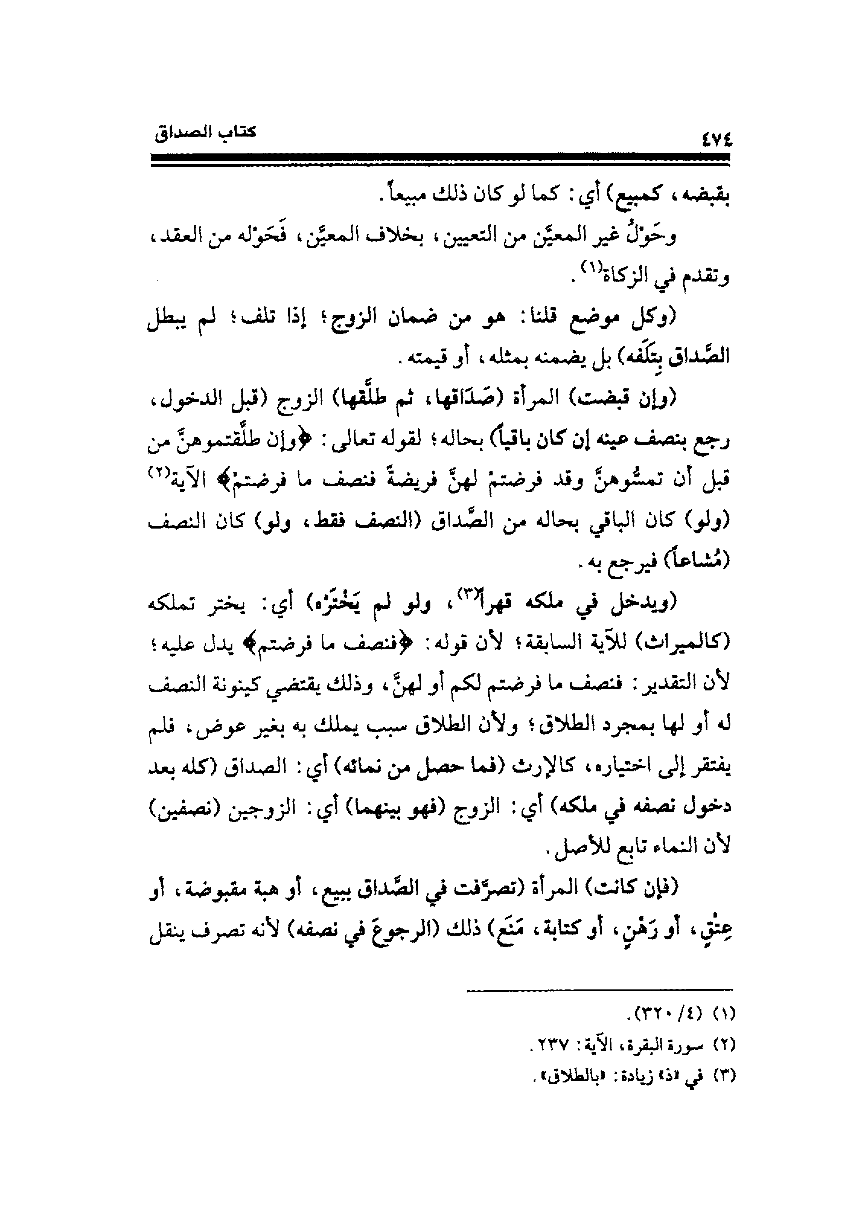 (وإن قبضت) المرأة (صَدَاقها، ثم طلَّقها) الزوج (قبل الدخول، رجع بنصف عينه إن كان باقيًا) بحاله؛ لقوله تعالى: {وَإِنْ طَلَّقْتُمُوهُنَّ مِنْ قَبْلِ أَنْ تَمَسُّوهُنَّ وَقَدْ فَرَضْتُمْ لَهُنَّ فَرِيضَةً فَنِصْفُ مَا فَرَضْتُمْ} الآية (¬٢) (ولو) كان الباقي بحاله من الصَّداق (النصف فقط، ولو) كان النصف (مُشاعًا) فيرجع به.
