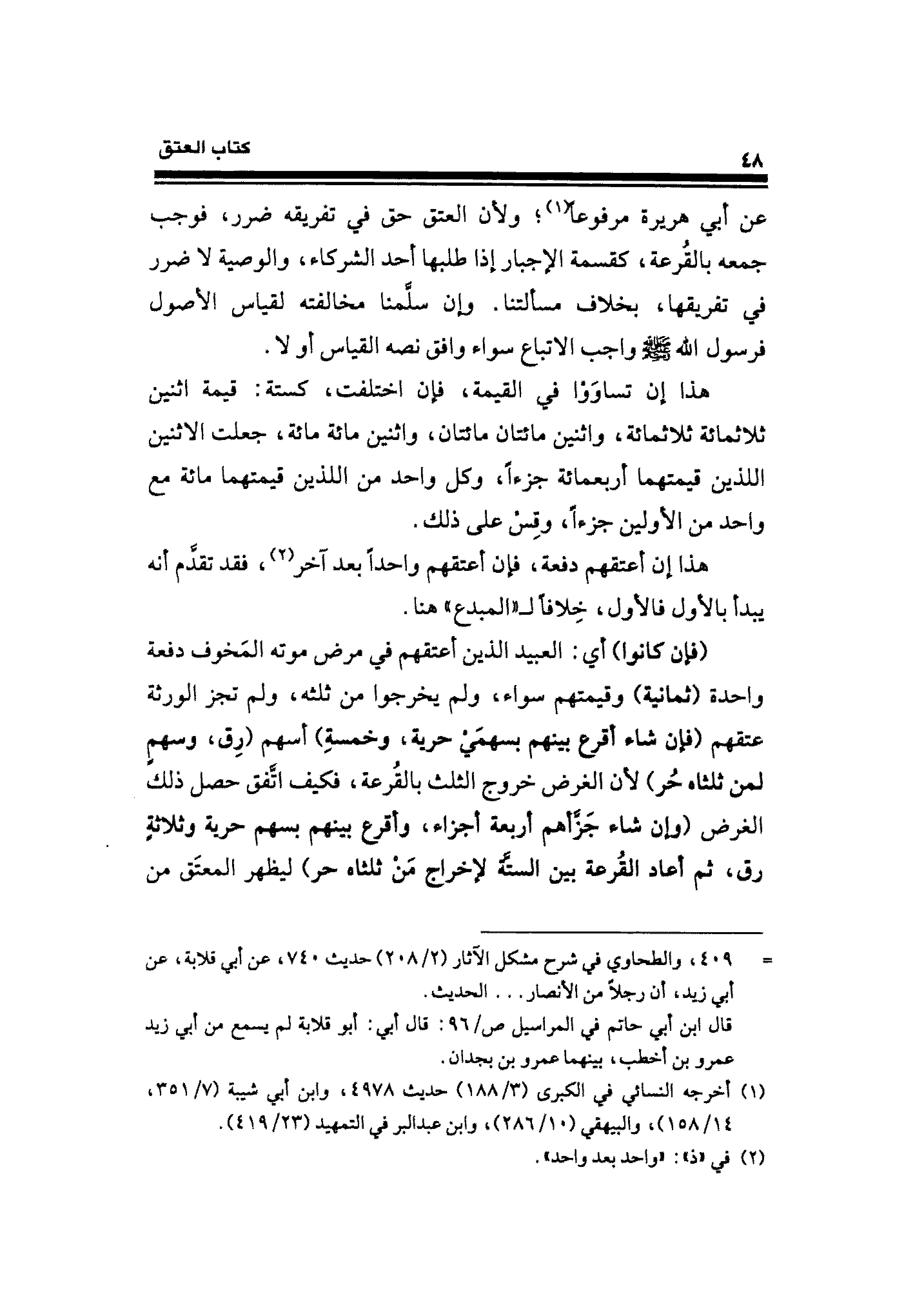 عن أبي هريرة مرفوعًا (¬١)؛ ولأن العتق حق في تفريقه ضرر، فوجب جمعه بالقُرعة، كقسمة الإجبار إذا طلبها أحد الشركاء، والوصية لا ضرر في تفريقها، بخلاف مسألتنا. وإن سلَّمنا مخالفته لقياس الأصول فرسول الله - صلى الله عليه وسلم - واجب الاتباع سواء وافق نصه القياس أو لا.