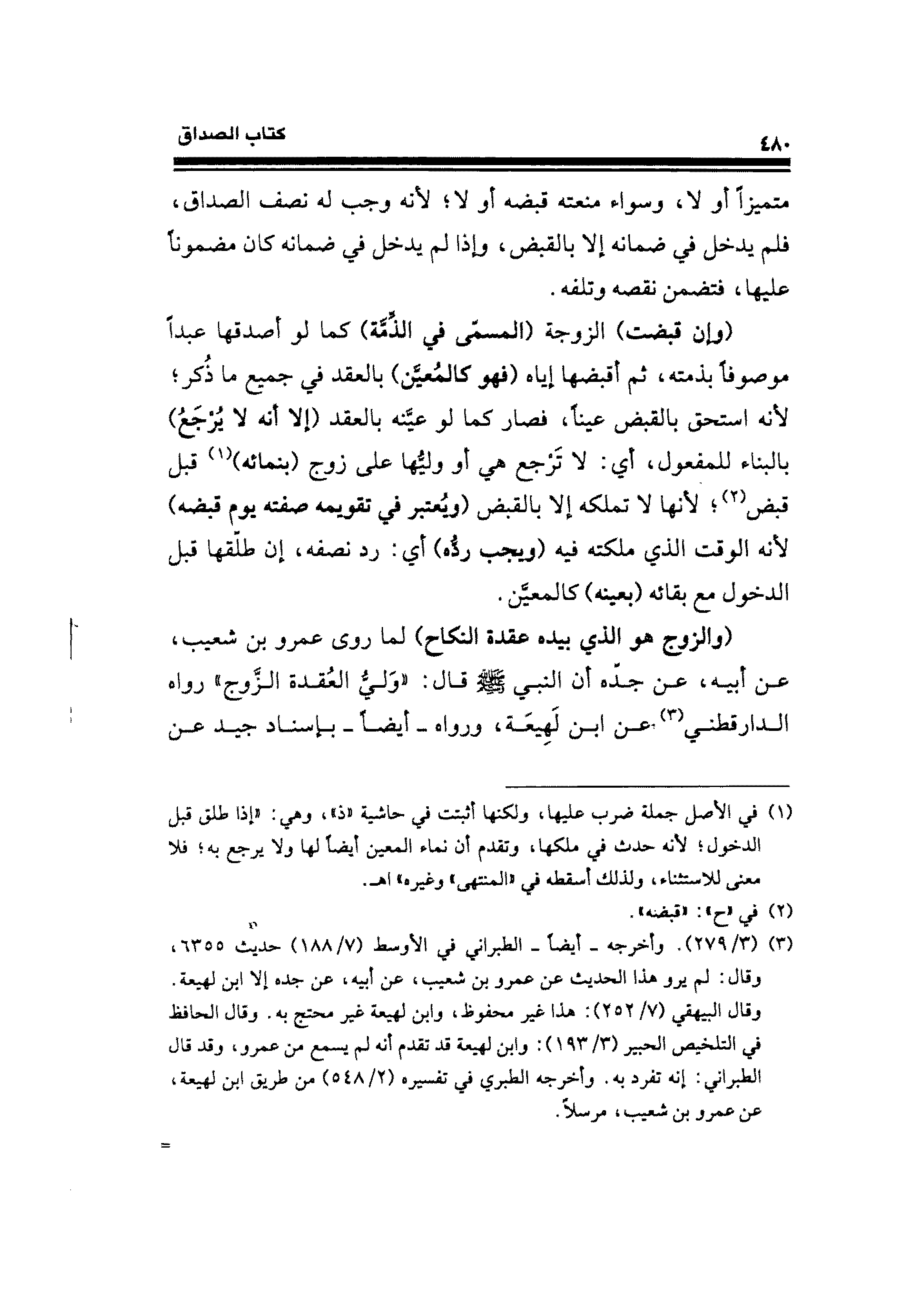 (وإن قبضت) الزوجة (المسمّى في الذِّمَّة) كما لو أصدقها عبدًا موصوفًا بذمته، ثم أقبضها إياه (فهو كالمُعيَّن) بالعقد في جميع ما ذُكر؛ لأنه استحق بالقبض عينًا، فصار كما لو عيَّنه بالعقد (إلا أنَّه لا يُرْجَعُ) بالبناء للمفعول، أي: لا تَرْجع هي أو وليُّها على زوج (بنمائه) (¬١) قبل قبض (¬٢)؛ لأنها لا تملكه إلا بالقبض (ويُعتبر في تقويمه صفته بوم قبضه) لأنه الوقت الَّذي ملكته فيه (ويجب ردُّه) أي: رد نصفه، إن طلَّقها قبل الدخول مع بقائة (بعينه) كالمعيَّن.