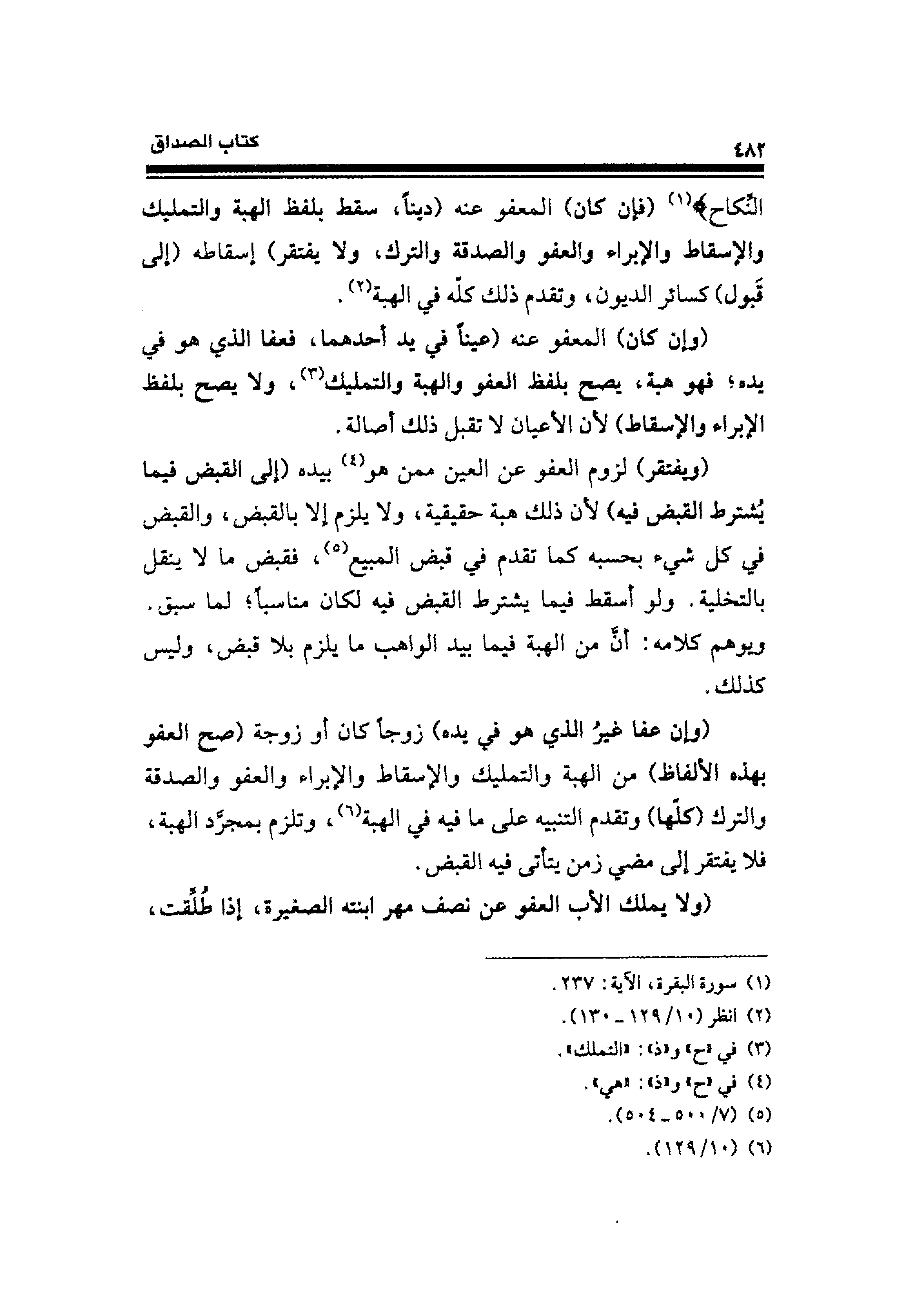النِّكَاحِ} (¬١) (فإن كان) المعفو عنه (دينًا، سقط بلفظ الهبة والتمليك والإسقاط والإبراء والعفو والصدفة والترك، ولا يفتقر) إسقاطه (إلى قَبول) كسائر الديرن، وتقدم ذلك كلّه في الهبة (¬٢).