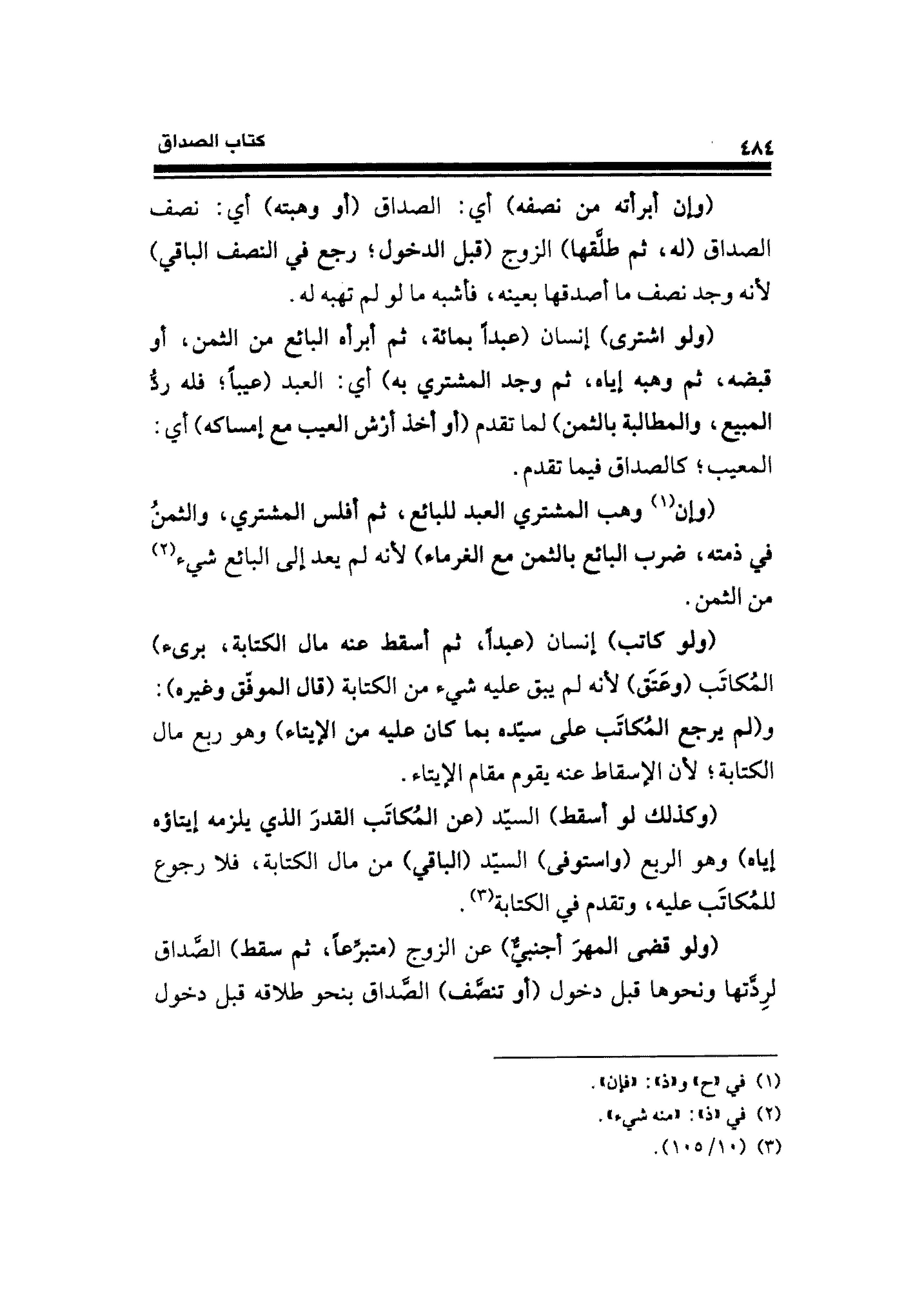 (وإن أبرأته من نصفه) أي: الصداق (أو وهبته) أي: نصف الصداق (له، ثم طلَّقها) الزوج (قبل الدخول؛ رجع في النصف الباقي) لأنه وجد نصف ما أصدقها بعينه، فأشبه ما لو تهبه له.