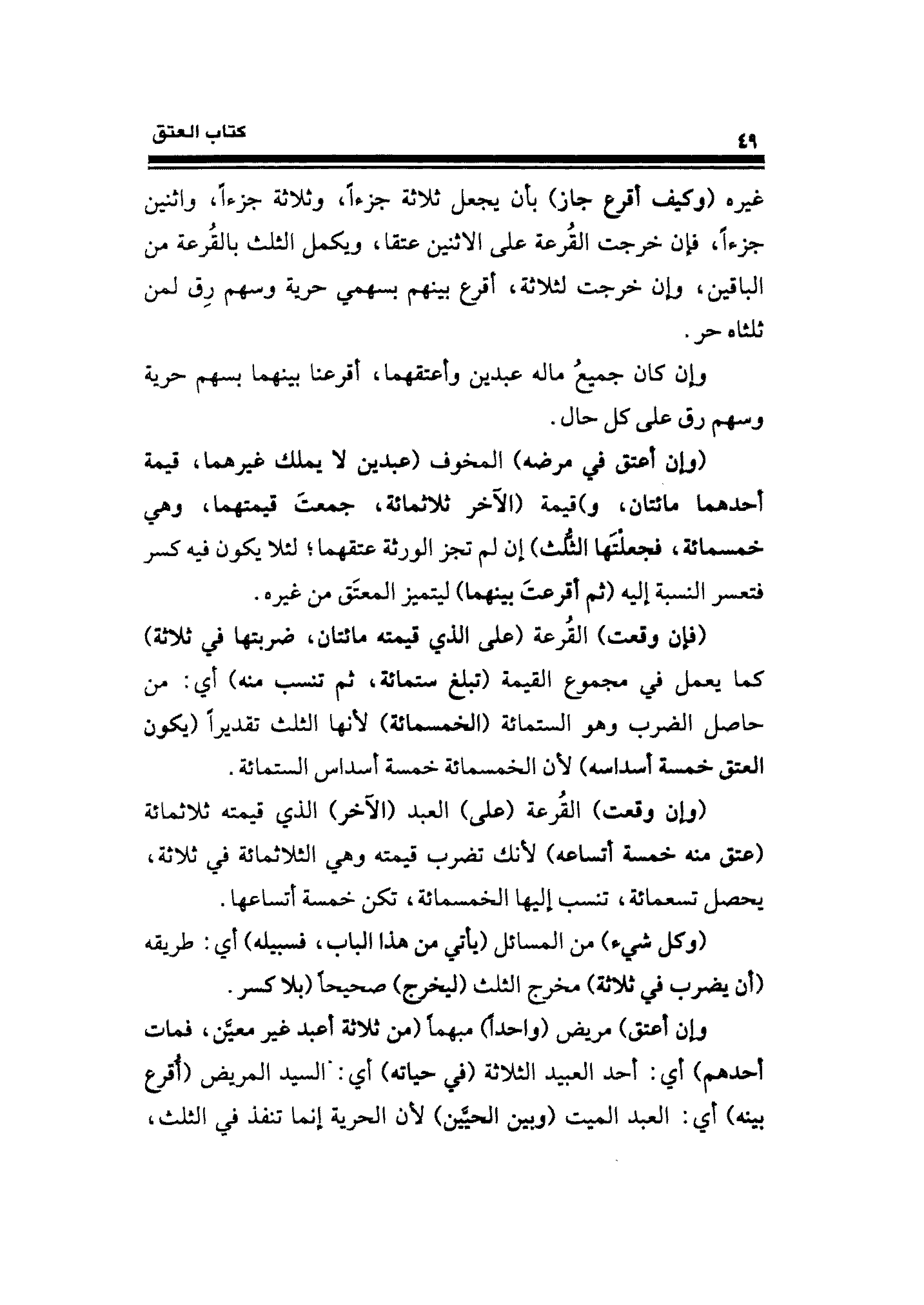 (فإن وقعت) القُرعة (على الذي قيمته مائتان، ضربتها في ثلاثة) كما يعمل في مجموع القيمة (تبلغ ستمائة، ثم تنسب منه) أي: من حاص الضرب وهو الستمائة (الخمسمائة) لأنها الثلث تقديرًا (يكون العتق خمسة أسداسه) لأن الخمسمائة خمسة أسداس الستمائة.