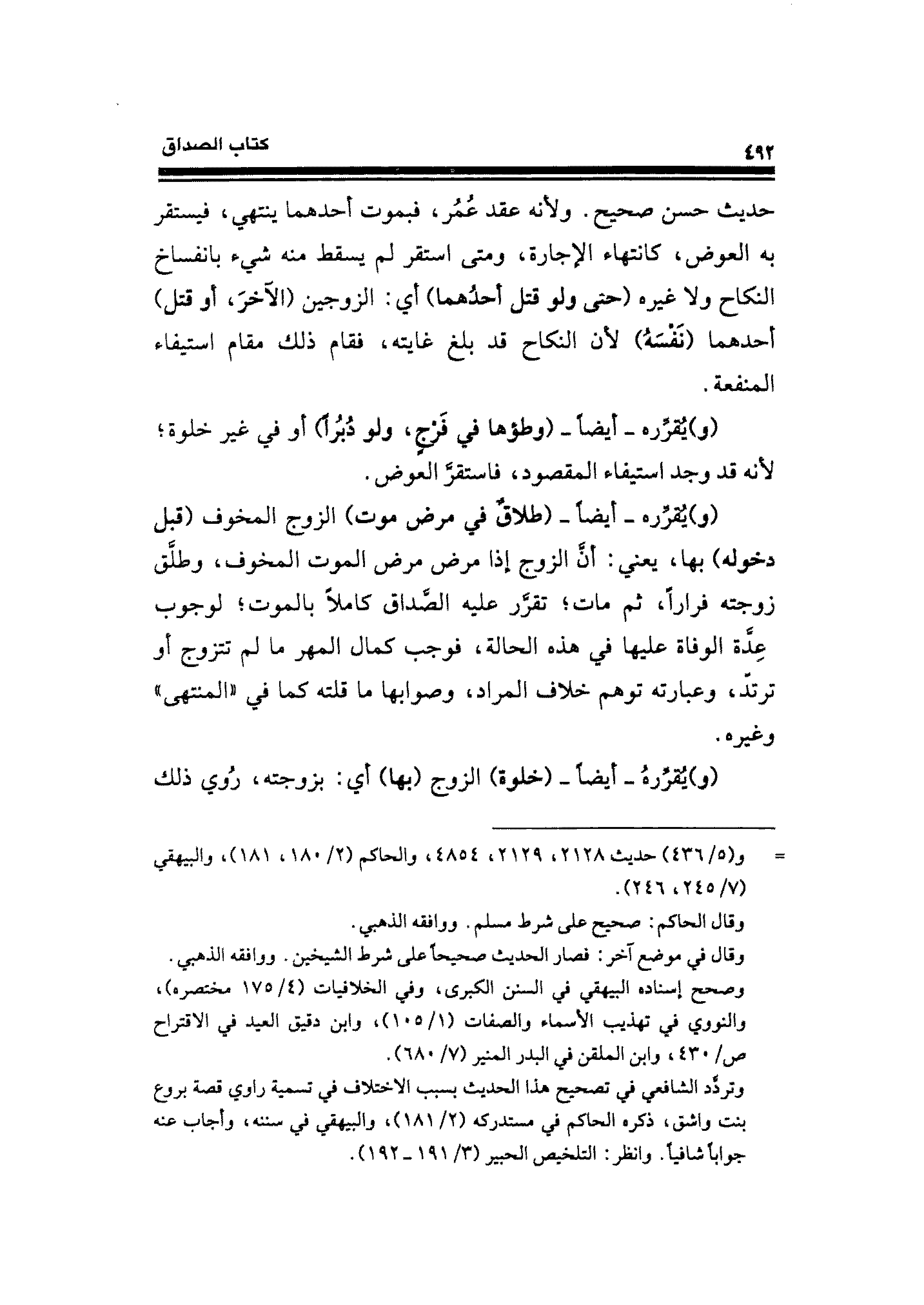حديث حسن صحيح. ولأنه عقد عُمُر، فبموت أحدهما ينتهي، فيستقر به العوض، كانتهاء الإجارة، ومتى استقر لم يسقط منه شيء بانفساخ النكاح ولا غيره (حتى ولو قتل أحدُهما) أي: الزوجين (الآخرَ، أو قتل) أحدهما (نَفْسَهُ) لأن النكاح قد بلغ غايته، فقام ذلك مقام استيفاء المنفعة.