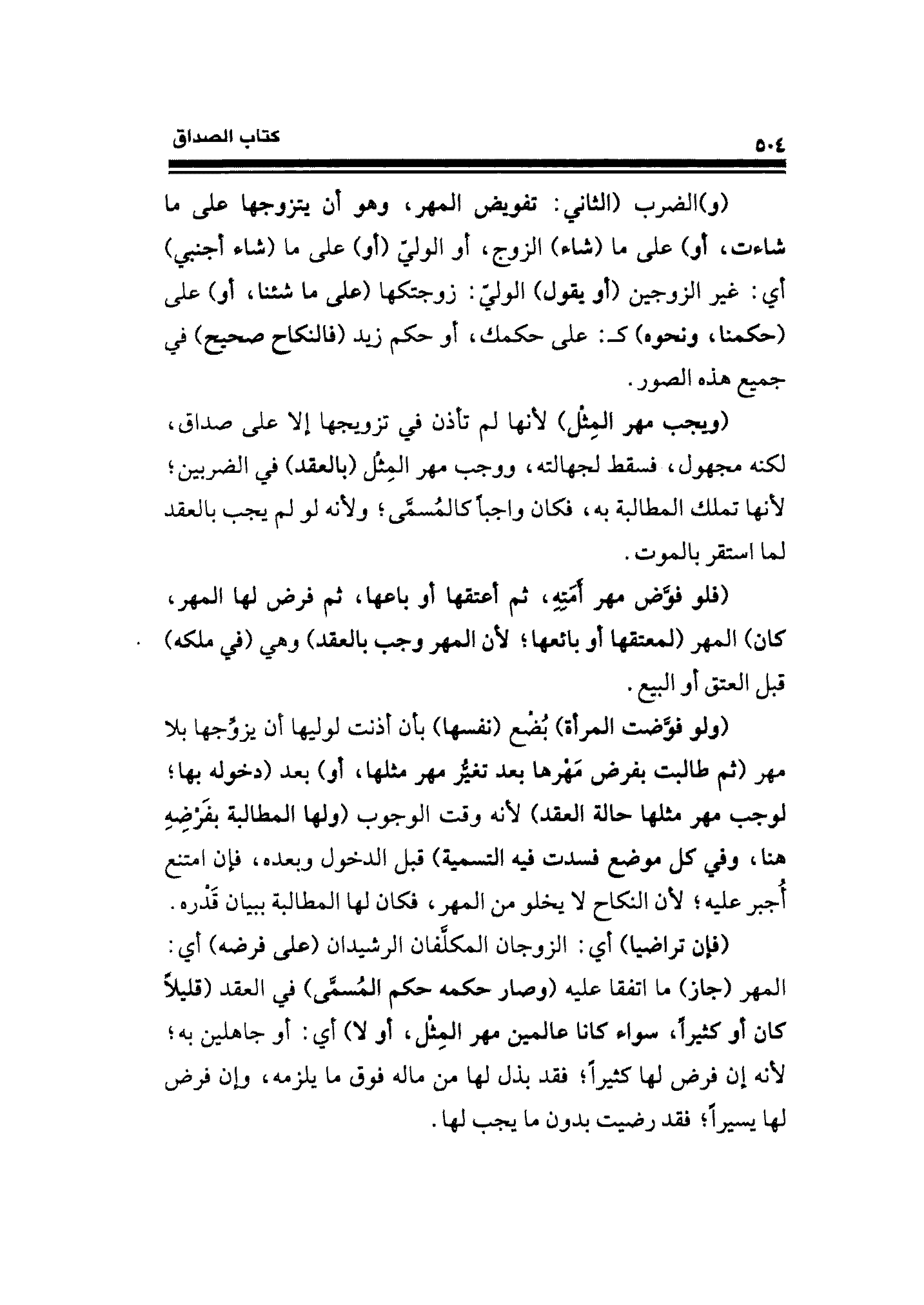 (و) الضرب (الثاني: تفويض المهر، وهو أن يتزوجها على ما شاءت، أو) على ما (شاء) الزوج، أو الوليّ (أو) على ما (شاء أجنبي) أي: غير الزوجين (أو يقول) الوليّ: زوجتكها (على ما شئنا، أو) على (حكمنا، ونحوه) كـ: على حكمك، أو حكم زيد (فالنكاح صحيح) في جميع هذه الصور.