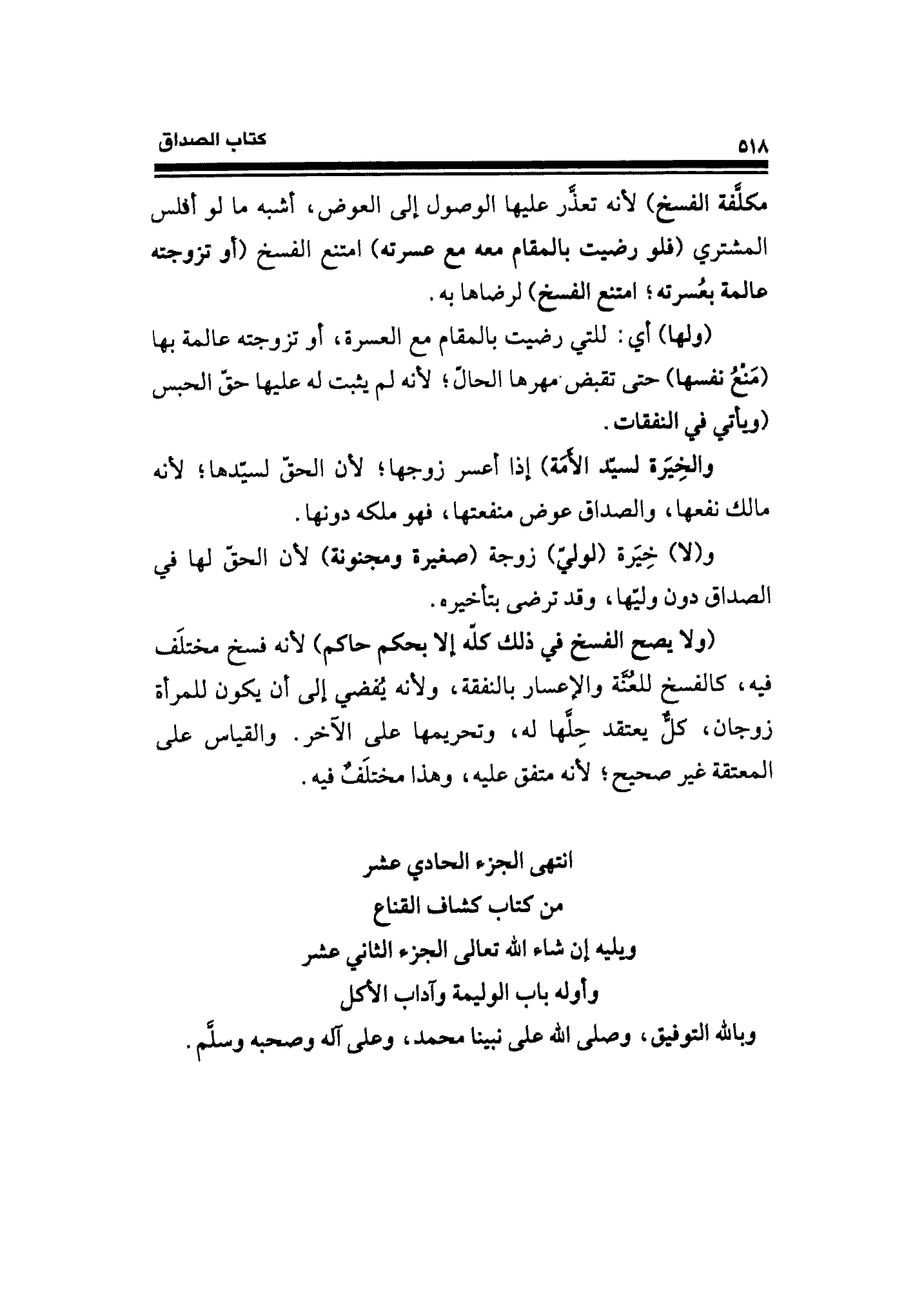 انتهى الجزء الحادي عشر من كتاب كشاف القناع ويليه إن شاء الله تعالى الجزء الثاني عشر وأوله باب الوليمة وآداب الأكل وبالله التوفيق، وصلى الله على نبينا محمد، وعلى آله وصحبه وسلَّم.