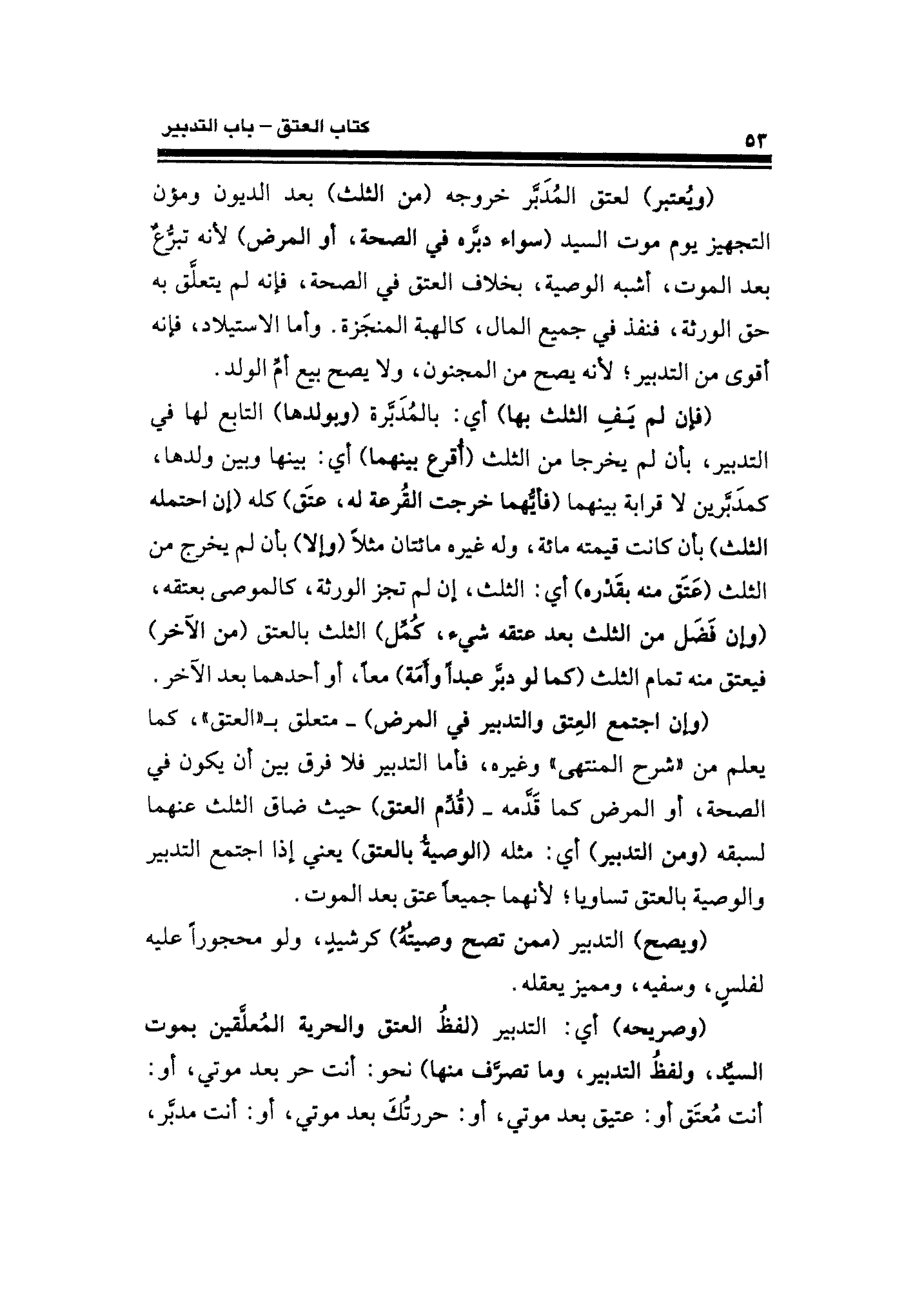 (ويُعتبر) لعتق المُدَبَّر خروجه (من الثلث) بعد الديون ومؤن التجهيز يوم موت السيد (سواء دبَّره في الصحة، أو المرض) لأنه تبرُّعٌ بعد الموت، أشبه الوصية، بخلاف العتق في الصحة، فإنه لم يتعلَّق به حق الورثة، فنفذ في جميع المال، كالهبة المنجَزة. وأما الاستيلاد، فإنه أقوى من التدبير؛ لأنه يصح من المجنون، ولا يصح بيع أمِّ الولد.