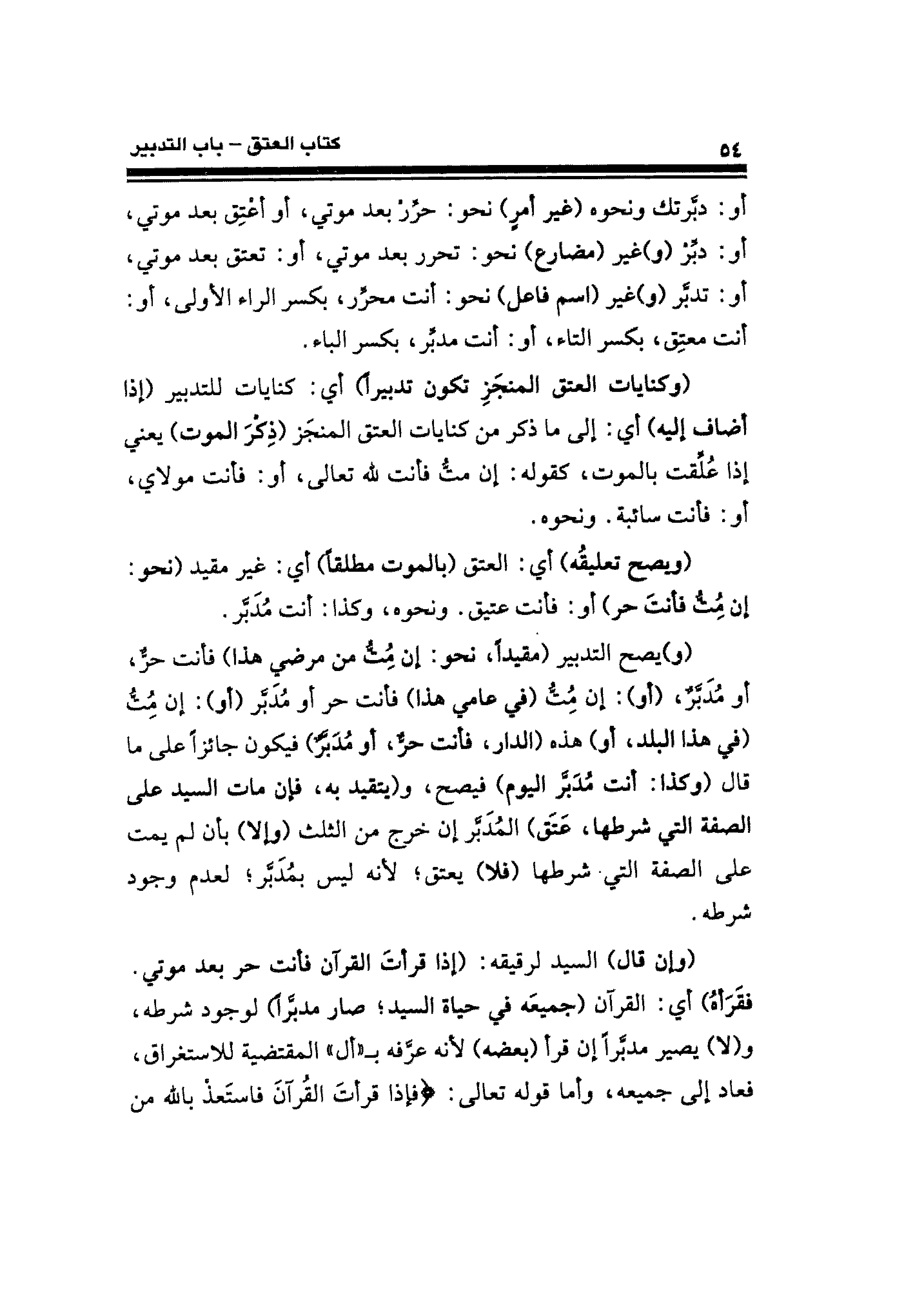 أو: دبَّرتك ونحوه (غير أمرٍ) نحر: حرِّرْ بعد موتي، أو أعْتِق بعد موتي، أو: دبِّرْ (و) غير (مضارع) نحو: تحرر بعد موتي، أو: تعتق بعد موتي، أو: تدبَّر (و) غير (اسم فاعل) نحو: أنت محرِّر، بكسر الراء الأولى، أو: أنت معتِق، بكسر التاء، أو: أنت مدبِّر، بكسر الباء.