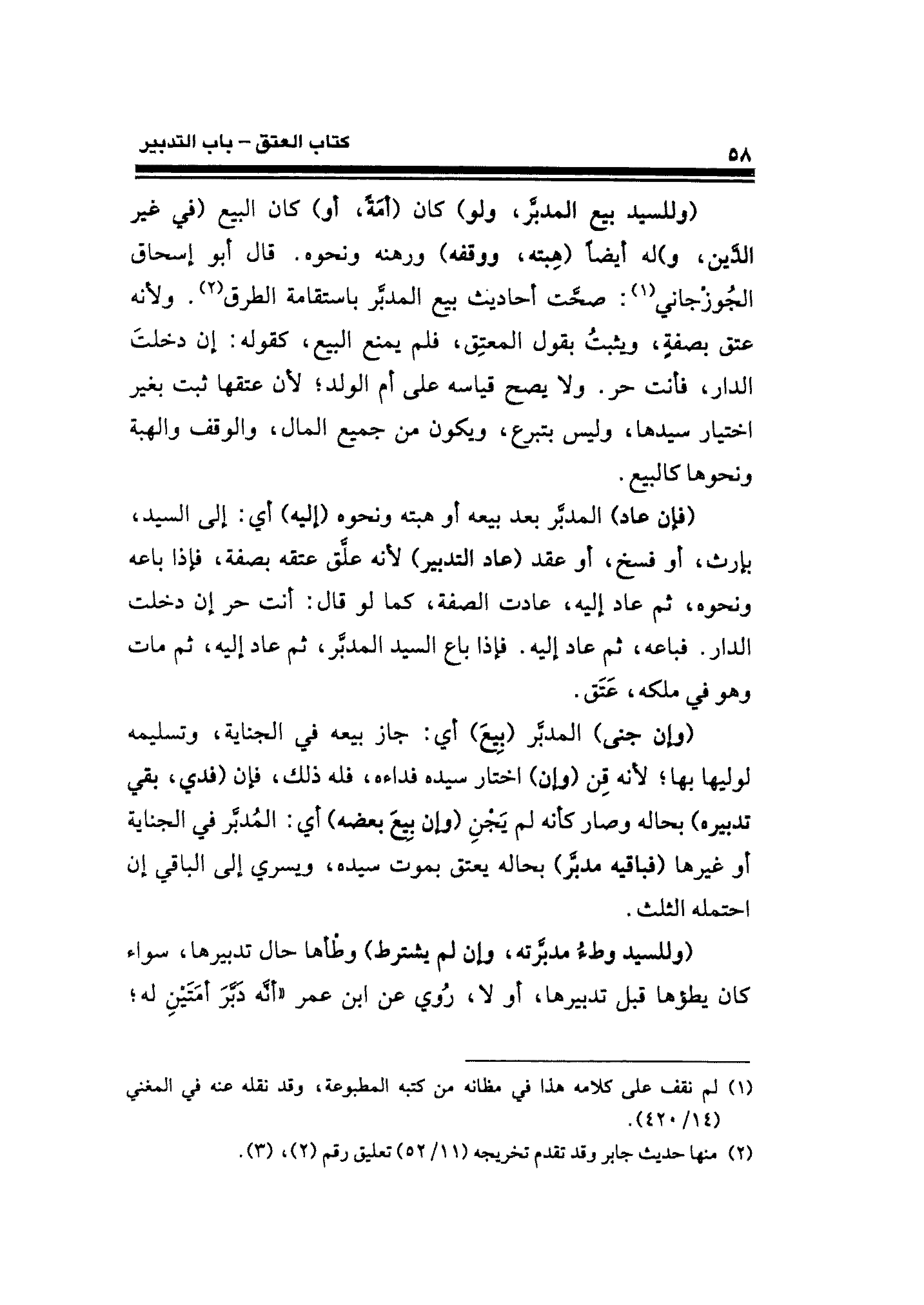 (وللسيد بيع المدبَّر، ولو) كان (أمَةً، أو) كان البيع (فِي غير الدَّين، و) له أَيضًا (هِبته، ووقفه) ورهنه ونحوه. قال أبو إسحاق الجُوزْجانيّ (¬١): صحَّت أحاديث بيع المدبَّر باستقامة الطرق (¬٢). ولأنه عتق بصفةٍ، ويثبتُ بقول المعتِق، فلم يمنع البيع، كقوله: إن دخلتَ الدار، فأنت حر. ولا يصح قياسه على أم الولد؛ لأن عتقها ثبت بغير اختيار سيدها، وليس بتبرع، ويكون من جميع المال، والوقف والهبة ونحوها كالبيع.