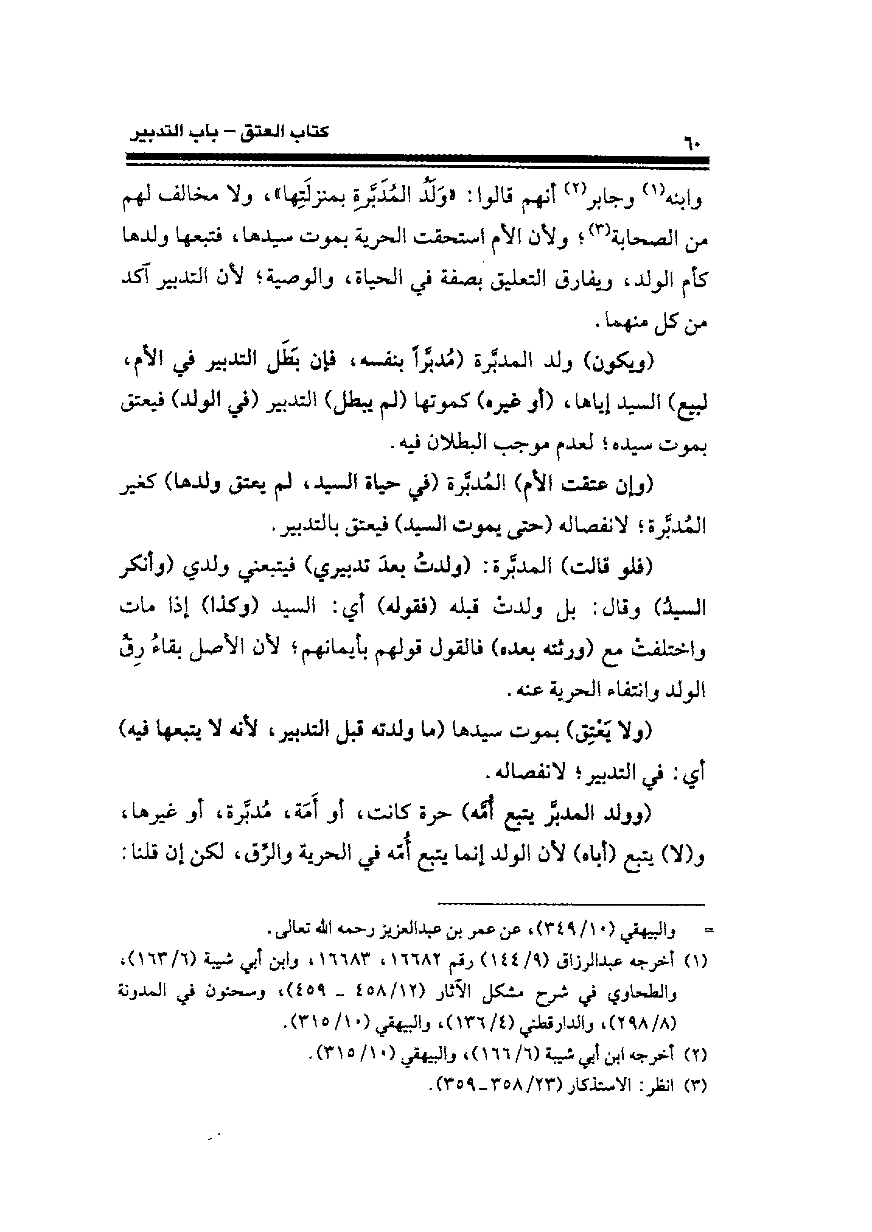 وابنه (¬١) وجابر (¬٢) أنَّهم قالوا: "وَلَدُ المُدَبَّرةِ بمنزلَتِها"، ولا مخالف لهم من الصحابة (¬٣)؛ ولأن الأم استحقت الحرية بموت سيدها، فتبعها ولدها كأم الولد، ويفارق التعليق بصفة فِي الحياة، والوصية؛ لأن التدبير آكد من كل منهما.