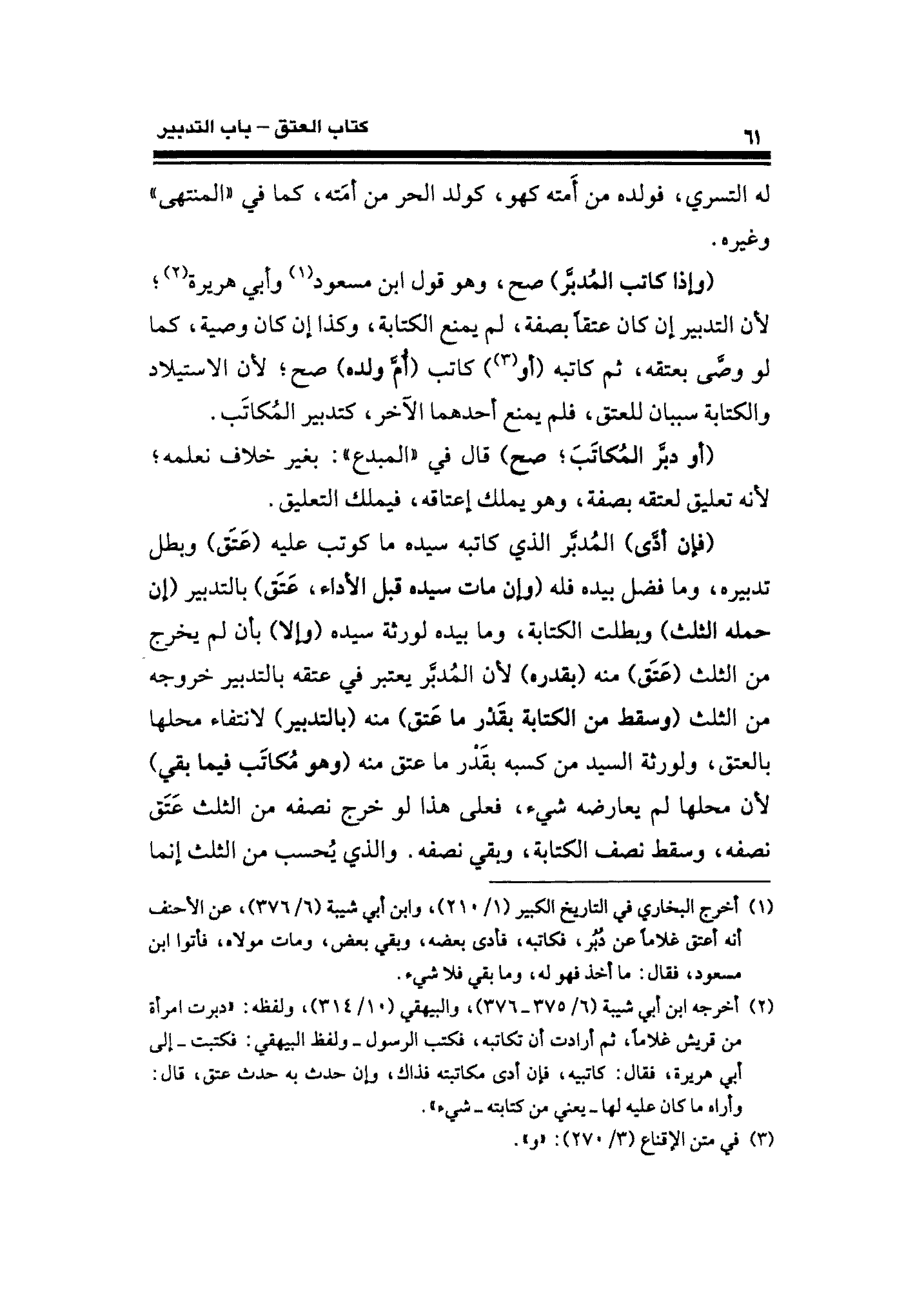 (¬٢) أخرجه ابن أبي شيبة (٦/ ٣٧٥ - ٣٧٦)، والبيهقي (١٠/ ٣١٤)، ولفظه: "دبرت امرأة من قريش غلامًا، ثم أرادت أن تكاتبه، فكتب الرسول -ولفظ البيهقي: فكتبت- إِلَى أبي هريرة، فقال: كاتبيه، فإن أدى مكاتبته فذاك، وإن حدث به حدث عتق، قال: وأراه ما كان عليه لها -يعني من كتابته- شيء".