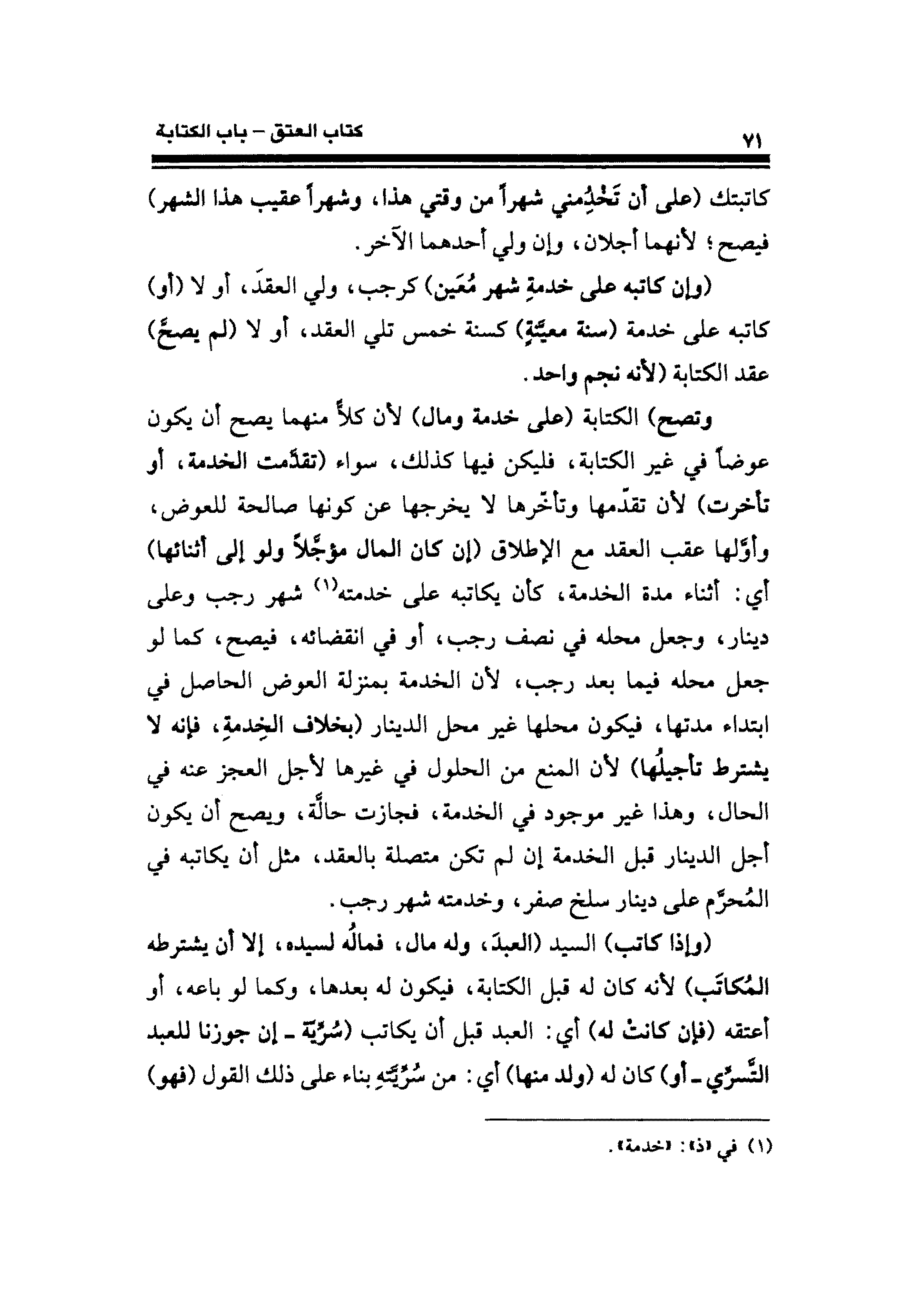 (وإن كاتبه على خدمه شهر مُعَين) كرجب، ولي العقدَ، أو لا (أو) كاتبه على خدمة (سنة معيَّنةٍ) كسنة خمس تلي العقد، أو لا (لم يصحَّ) عقد الكتابة (لأنه نجم واحد.