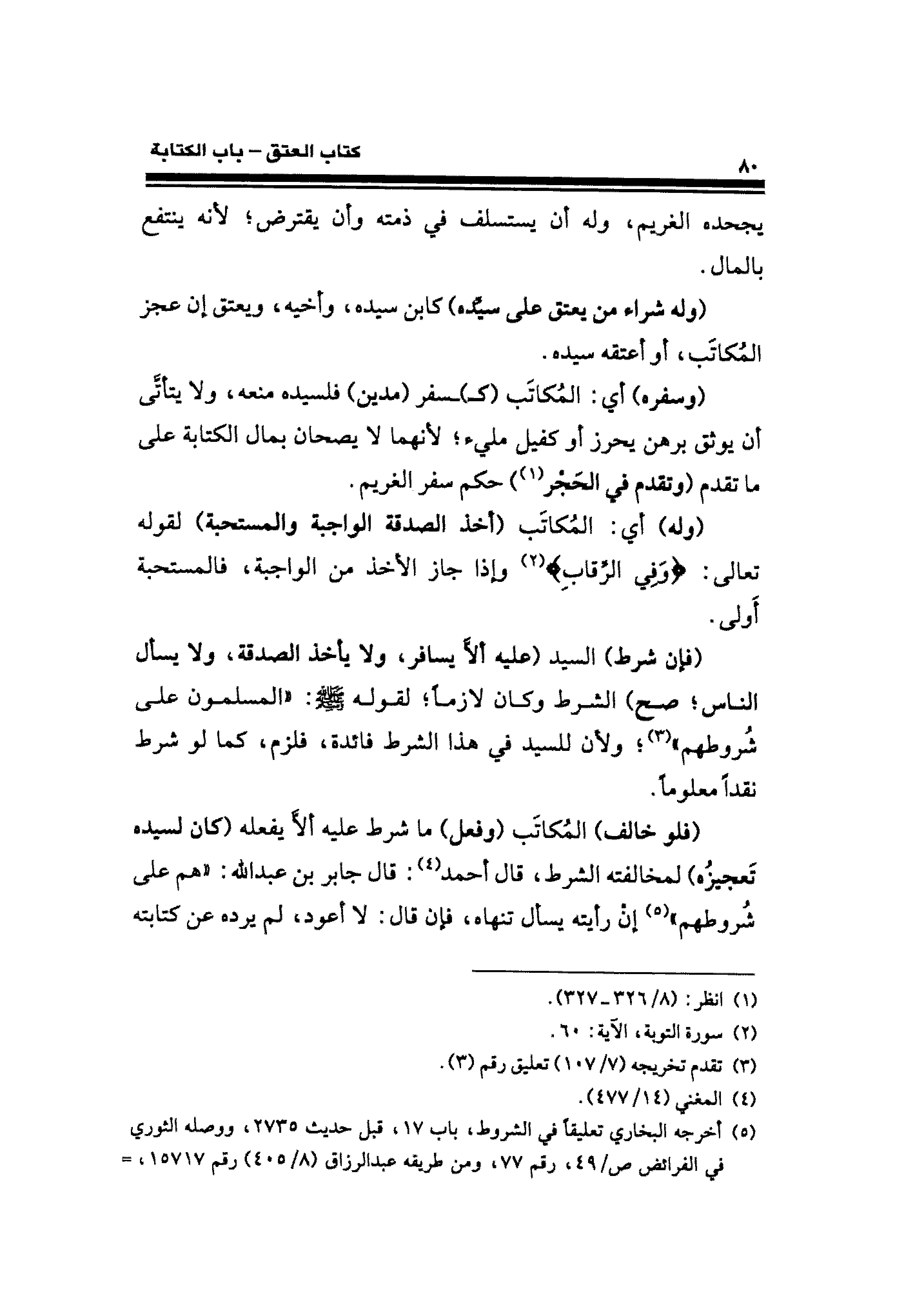 (فإن شرط) السيد (عليه ألَّا يسافر، ولا يأخذ الصدقة، ولا يسأل الناس؛ صح) الشرط وكان لازمًا؛ لقوله - صلى الله عليه وسلم -: "المسلمون على شُروطهم" (¬٣)؛ ولأن للسيد في هذا الشرط فائدة، فلزم، كما لو شرط نقدًا معلومًا.