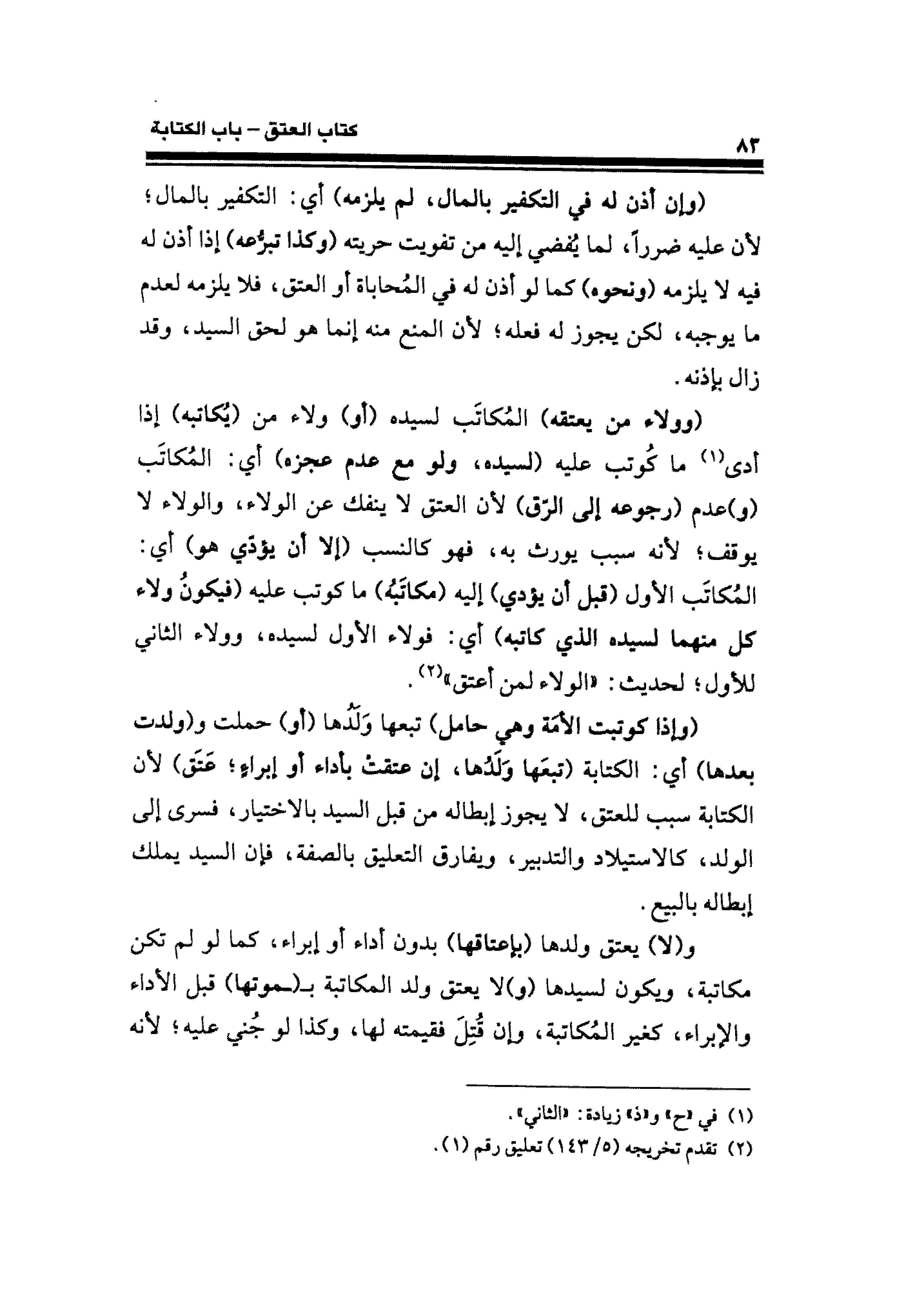 (وولاء من يعتقه) المُكاتَب لسيده (أو) ولاء من (يُكاتبه) إذا أدى (¬١) ما كُوتب عليه (لسيده، ولو مع عدم عجزه) أي: المُكاتَب (و) عدم (رجوعه إلى الرّق) لأن العتق لا ينفك عن الولاء، والوَّلاء لا يوقف؛ لأنه سبب يورث به، فهو كالنسب (إلا أن يؤدي هو) أي: المُكاتَب الأول (قبل أن يؤدي) إليه (مكاتَبهُ) ما كوتب عليه (فيكونُ ولاء كل منهما لسيده الذي كاتبه) أي: فولاء الأول لسيده، وولاء الثاني للأول؛ لحديث: "الولاء لمن أعتق" (¬٢).