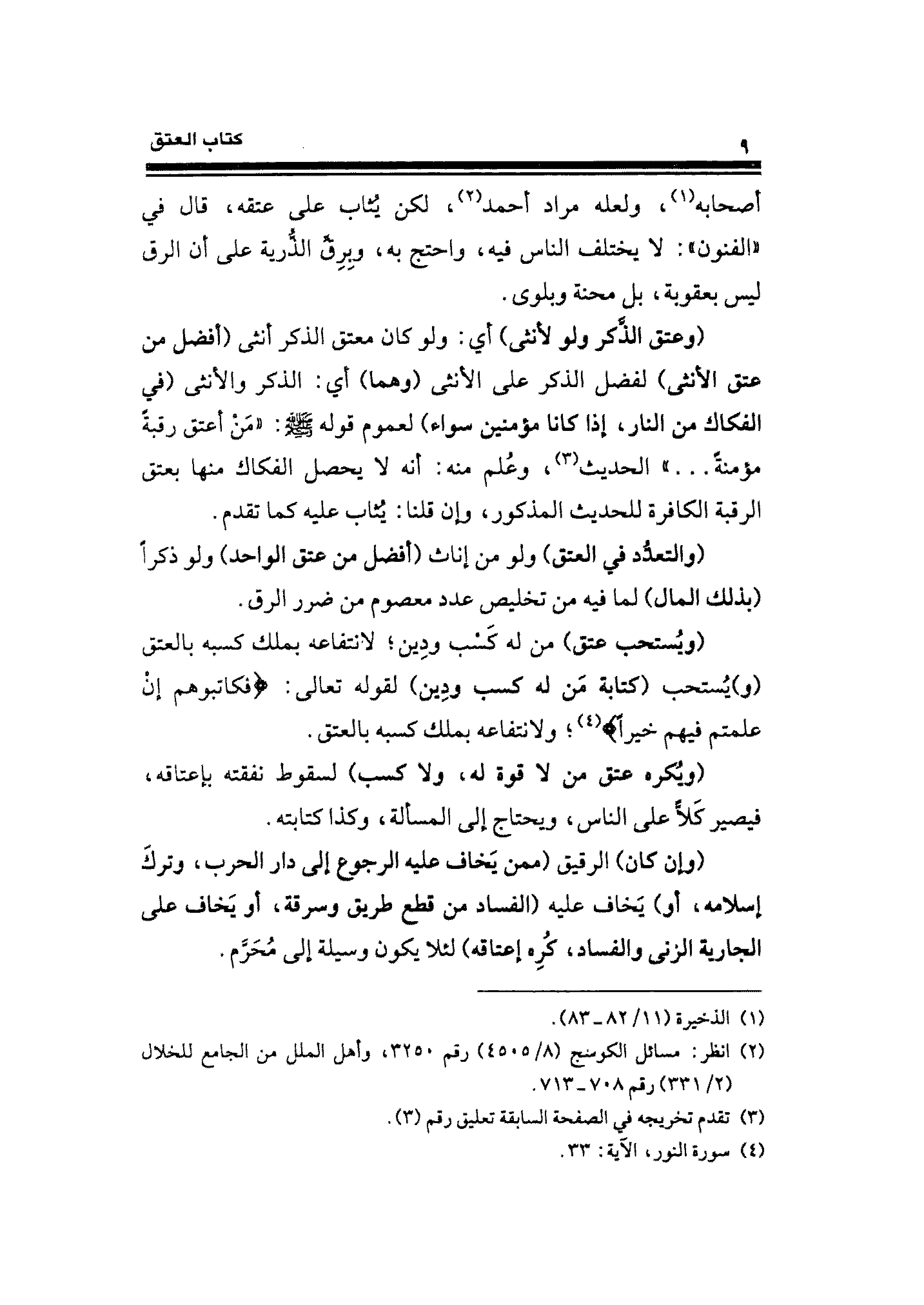 أصحابه (¬١)، ولعله مراد أحمد (¬٢)، لكلن يُثاب على عتقه، قال في "الفنون": لا يختلف الناس فيه، واحتج به، وِبِرِقِّ الذُّرية على أن الرق ليس بعقوبة، بل محنة وبلوى.