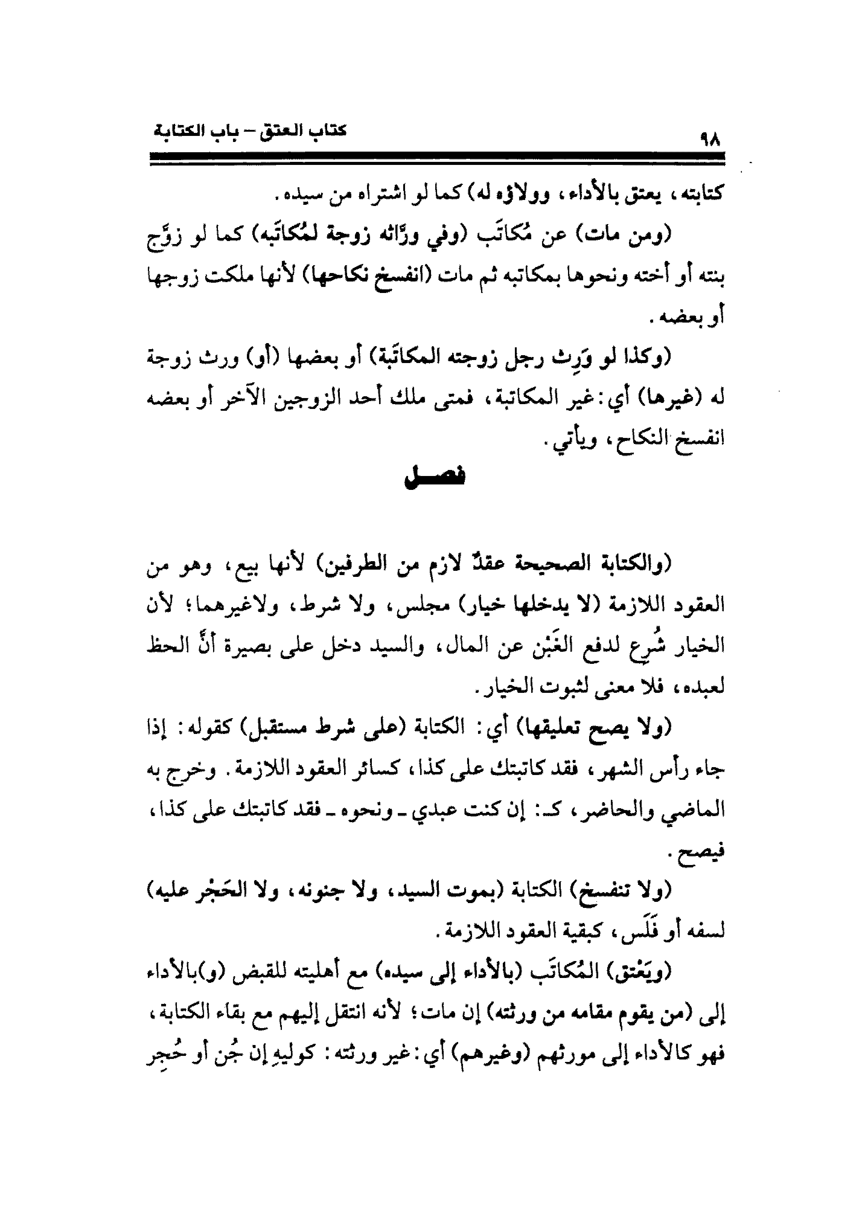 (والكتابة الصحيحة عقدٌ لازم من الطرفين) لأنها بيع، وهو من العقود اللازمة (لا يدخلها خيار) مجلس، ولا شرط، ولا غيرهما؛ لأن الخيار شُرع لدفع الغَبْن عن المال، والسيد دخل على بصيرة أنَّ الحظ لعبده، فلا معنى لثبوت الخيار.