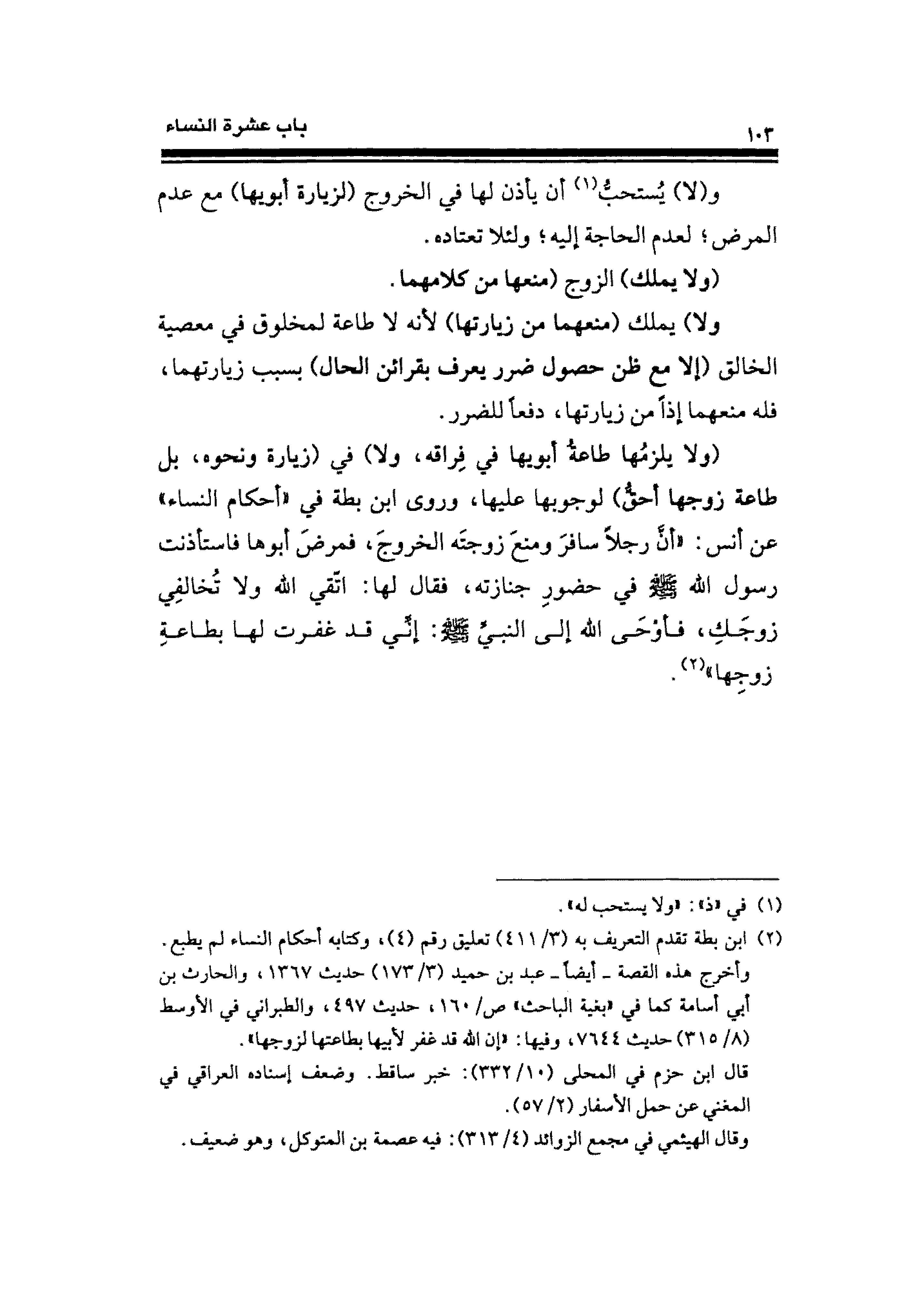 (ولا يلزمُها طاعةُ أبويها فِي فِراقه، ولا) فِي (زيارة ونحوه، بل طاعة زوجها أحقُّ) لوجوبها عليها، وروى ابن بطة في "أحكام النساء" عن أنس: "أنَّ رجلًا سافرَ ومنعَ زوجتَه الخروجَ، فمرضَ أبوها فاستأذنت رسول الله - صلى الله عليه وسلم - فِي حضورِ جنازته، فقال لها: اتّقي الله ولا تُخالفِي زوجَكِ، فأوْحَى الله إِلَى النَّبِيِّ - صلى الله عليه وسلم -: إِنِّي قد غفرت لها بطاعةِ زوجِها" (¬٢).