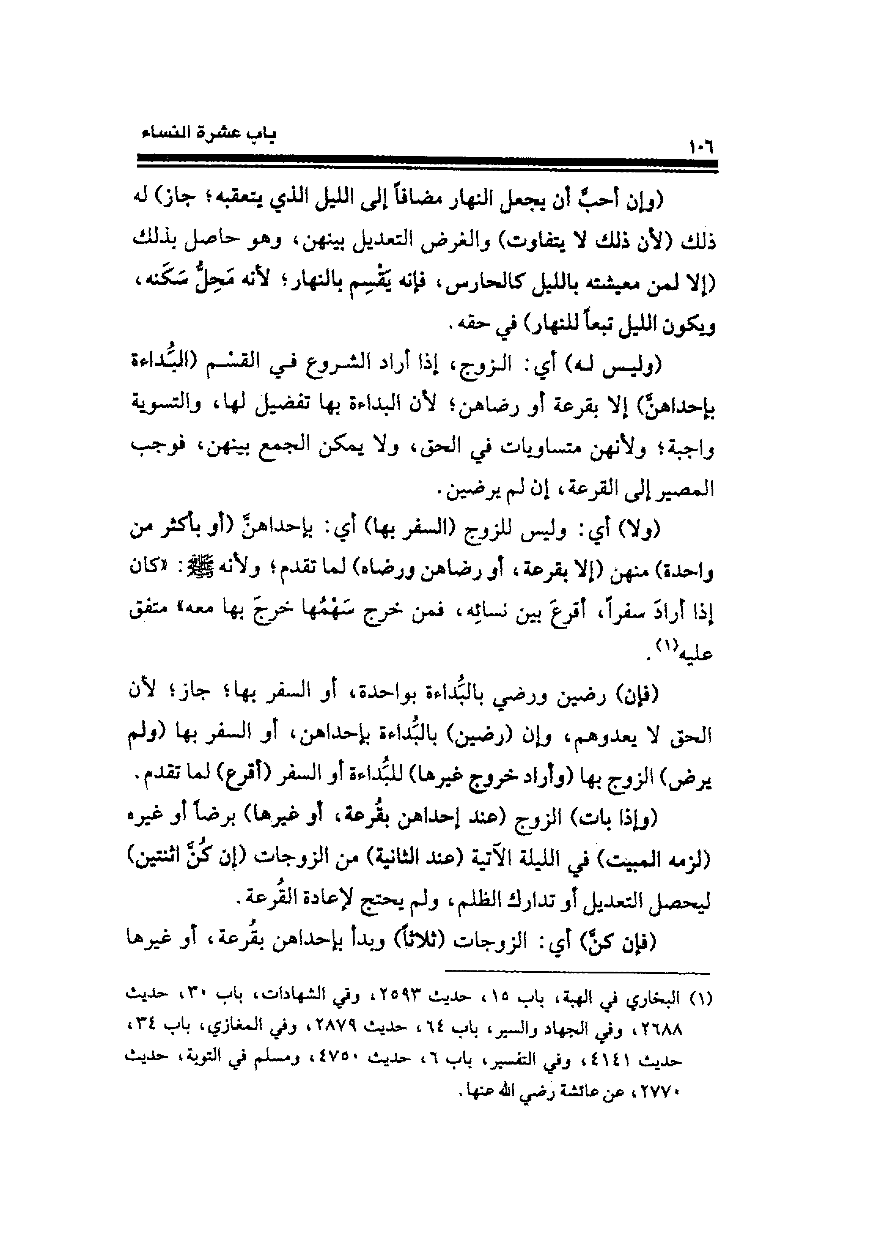 (ولا) أي: وليس للزوج (السفر بها) أي: بإحداهنَّ (أو بأكثر من واحدة) منهن (إلَّا بقرعة، أو رضاهن ورضاه) لما تقدم؛ ولأنه - صلى الله عليه وسلم -: "كان إذا أَرادَ سفرًا، أقرعَ بين نسائِه، فمن خرج سَهْمُها خرجَ بها معه" متفق عليه (¬١).