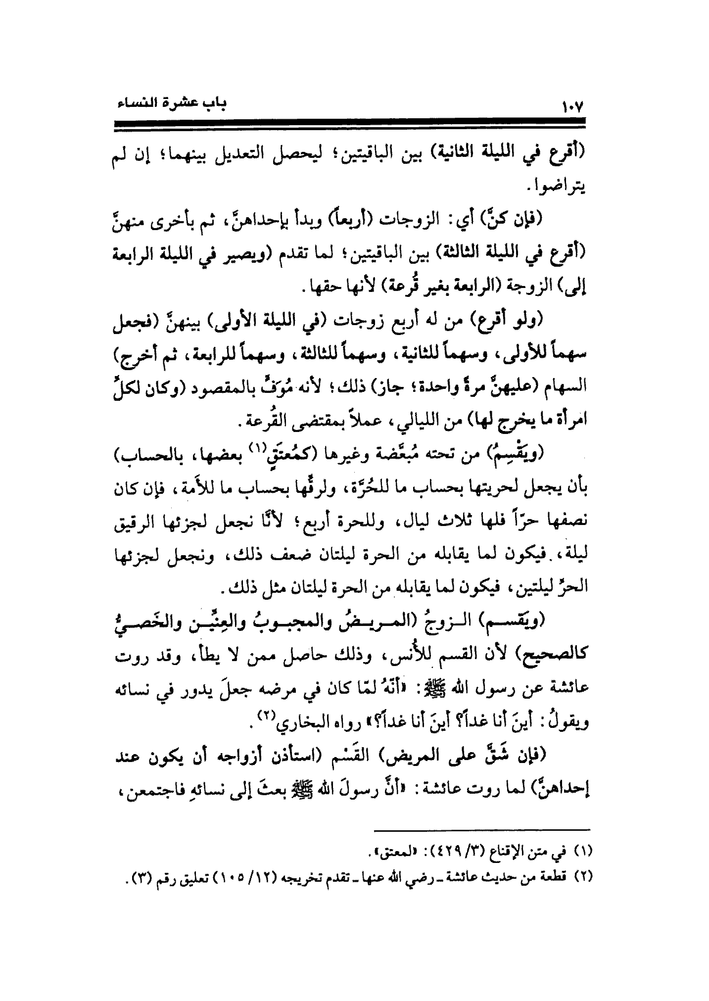 (ويَقسم) الزوجُ (المريض والمجبوبُ والعِنِّين والخَصيُّ كالصحيح) لأن القسم للأُنس، وذلك حاصل ممن لا يطأ، وقد روت عائشة عن رسول الله - صلى الله عليه وسلم -: "أنّهُ لمّا كان في مرضه جعلَ يدور فِي نسائه ويقولُ: أينَ أنا غدًا؟ أينَ أنا غدًا؟ " رواه البخاري (¬٢).