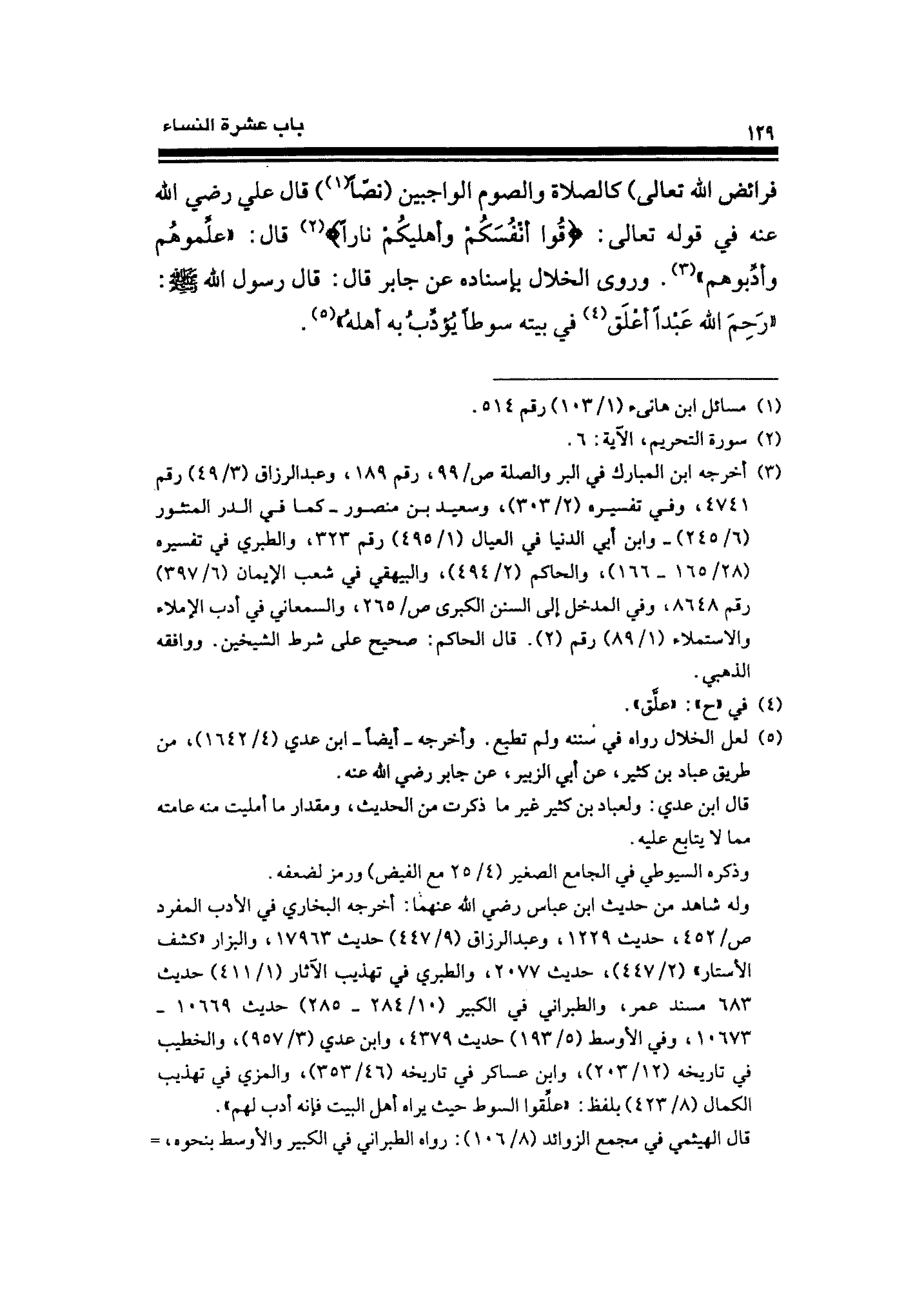 فرائض الله تعالى) كالصلاة والصوم الواجبين (نصًّا (¬١)) قال علي رضي الله عنه في قوله تعالى: {قُوا أَنْفُسَكُمْ وَأَهْلِيكُمْ نَارًا} (¬٢) قال: "علِّموهُم وأدِّبوهم" (¬٣). وروى الخلال بإسناده عن جابر قال: قال رسول الله - صلى الله عليه وسلم -: "رَحِمَ الله عَبْدًا أعْلَق (¬٤) في بيته سوطًا يُؤدِّبُ به أهلهُ" (¬٥).