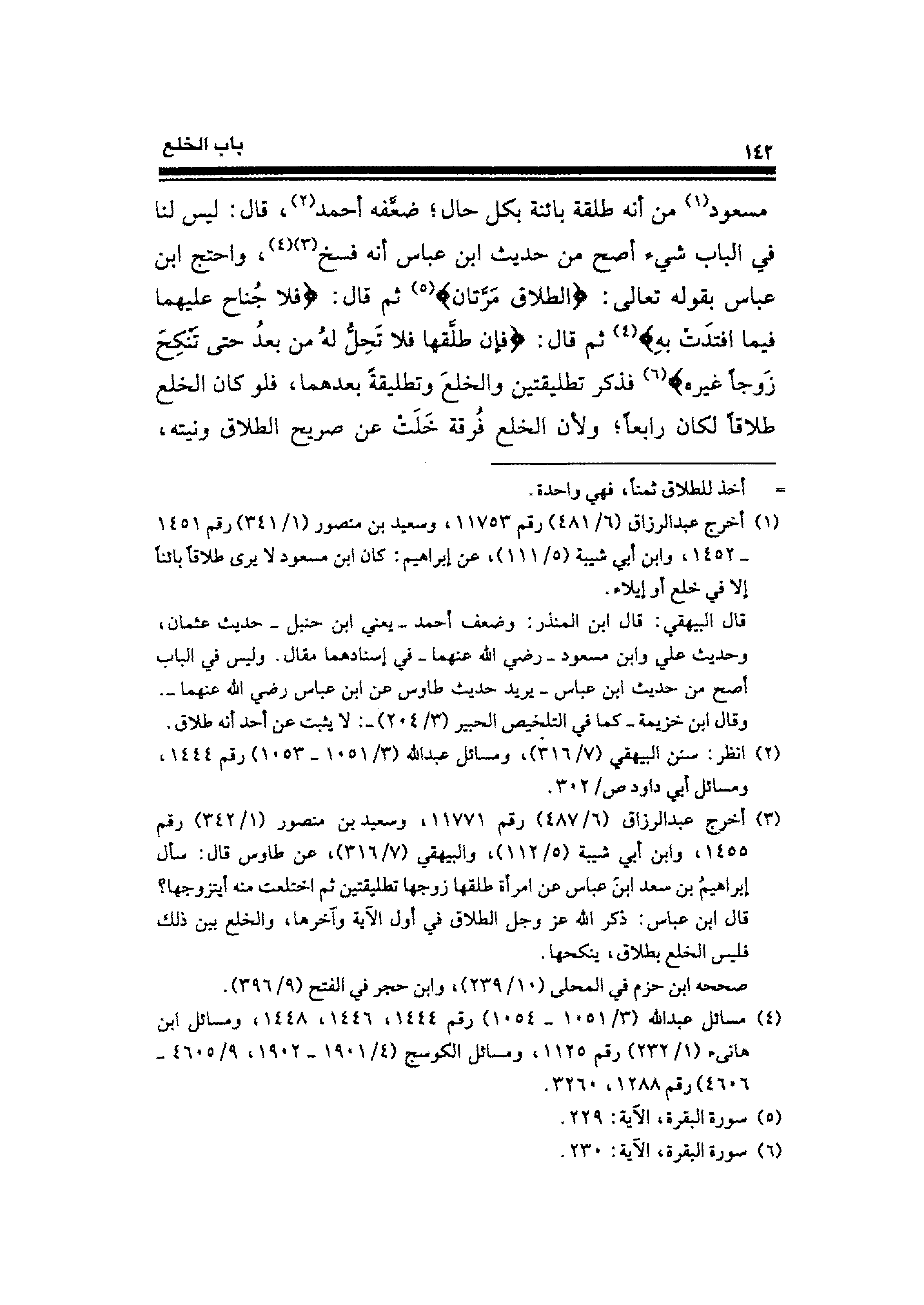 (¬٣) أخرج عبد الرزاق (٦/ ٤٨٧) رقم ١١٧٧١، وسعيد بن منصور (١/ ٣٤٢) رقم ١٤٥٥، وابن أبي شيبة (٥/ ١١٢)، والبيهقي (٧/ ٣١٦)، عن طاوس قال: سأل إبراهيمُ بن سعد ابن عباس عن امرأة طلقها زوجها تطليقتين ثم اختلعت منه أيتزوجها؟ قال ابن عباس: ذكر الله عزَّ وجلَّ الطلاق في أول الآية وآخرها، والخلع بين ذلك فليس الخلع بطلاق، ينكحها.
