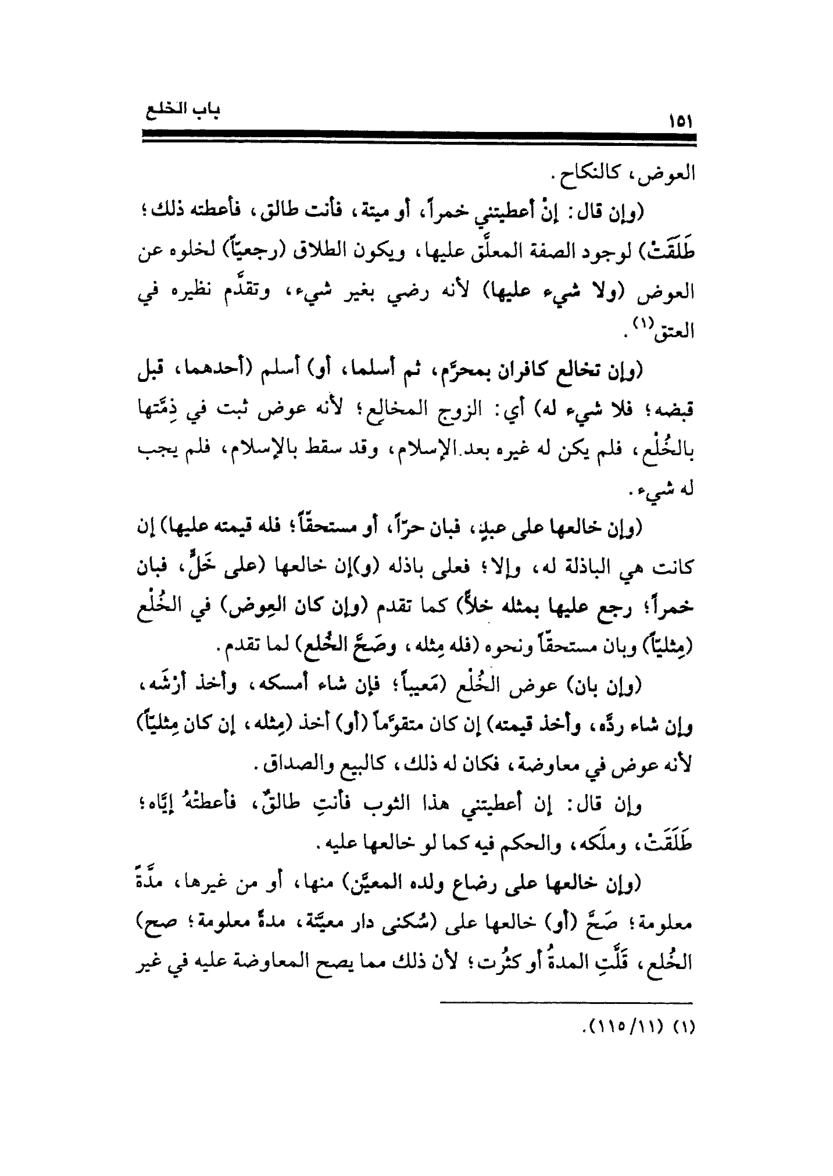 (وإن بان) عوض الخُلع (مَعيبًا؛ فإن شاء أمسكه، وأخذ أرشَه، وإن شاء ردَّه، وأخذ قيمته) إن كان متقومًا (أو) أخذ (مثِله، إن كان مِثليًّا) لأنَّه عوض في معاوضة، فكان له ذلك، كالبيع والصداق.