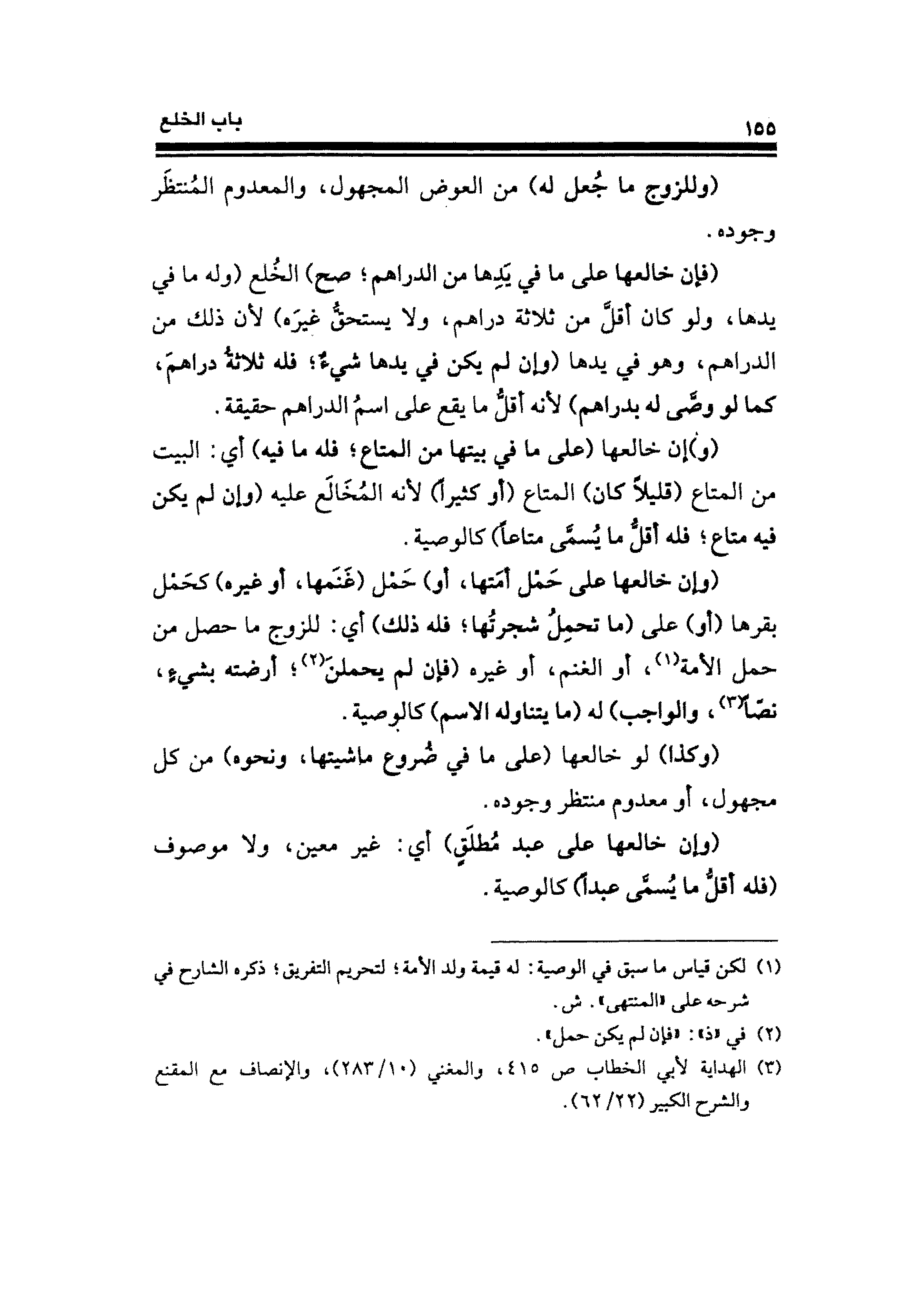 (فإن خالعها على ما في يَدِها من الدراهم؛ صح) الخُلع (وله ما في يدها، ولو كان أقلَّ من ثلاثة دراهم، ولا يستحقُّ غيرَه) لأنَّ دلك من الدراهم، وهو في يدها (وإن لم يكن في يدها شيءٌ؛ فله ثلاثة دراهمَ، كما لو وصَّى له بدراهم) لأنَّه أقل ما يقع على اسمُ الدراهم حقيقة.