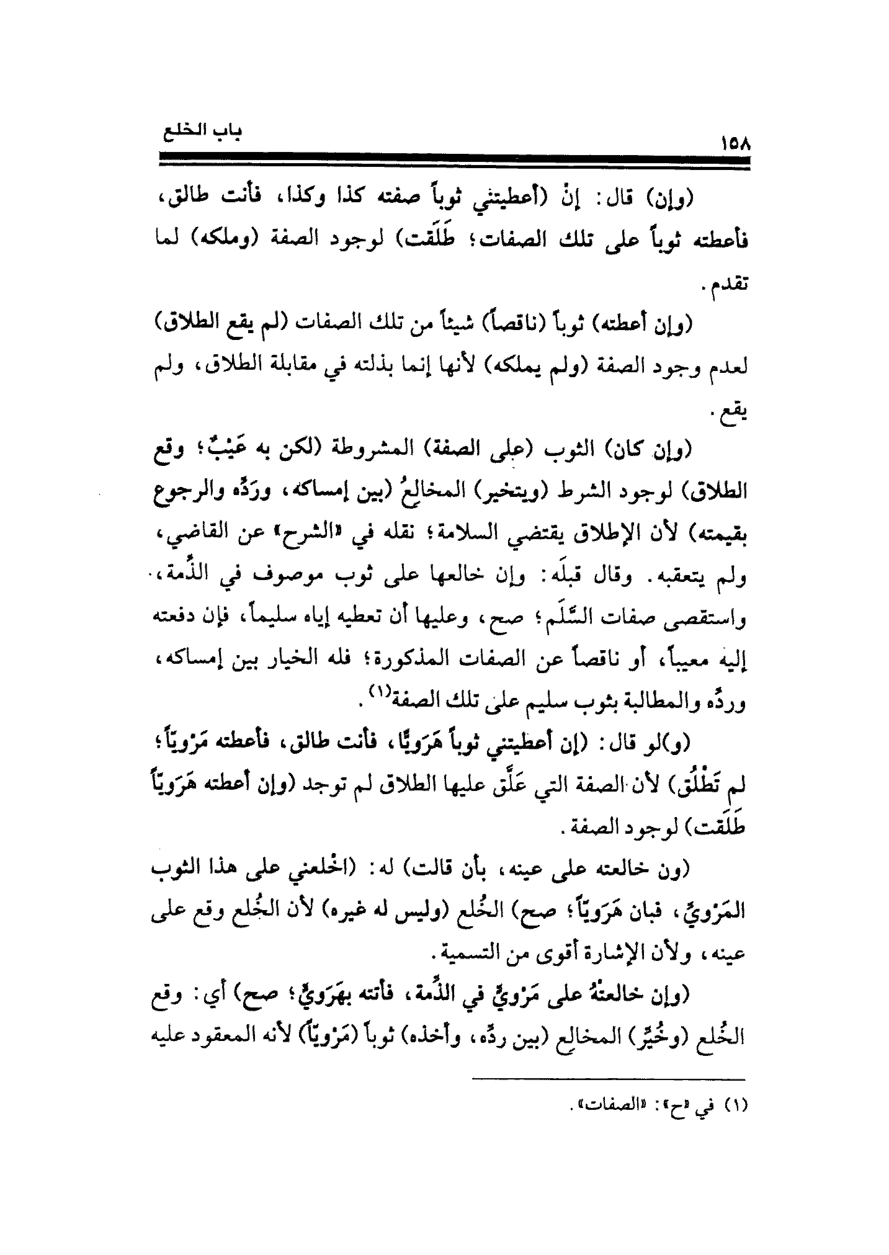 (و) لو قال: (إن أعطيتني ثوبًا هَرَويًّا، فأنت طالق، فأعطته مَرويًّا؛ لم تَطْلُق) لأن الصفة التي عَلَّق عليها الطلاق لم توجد (وإن أعطته هَرَويًّا طلقت) لوجود الصفة.